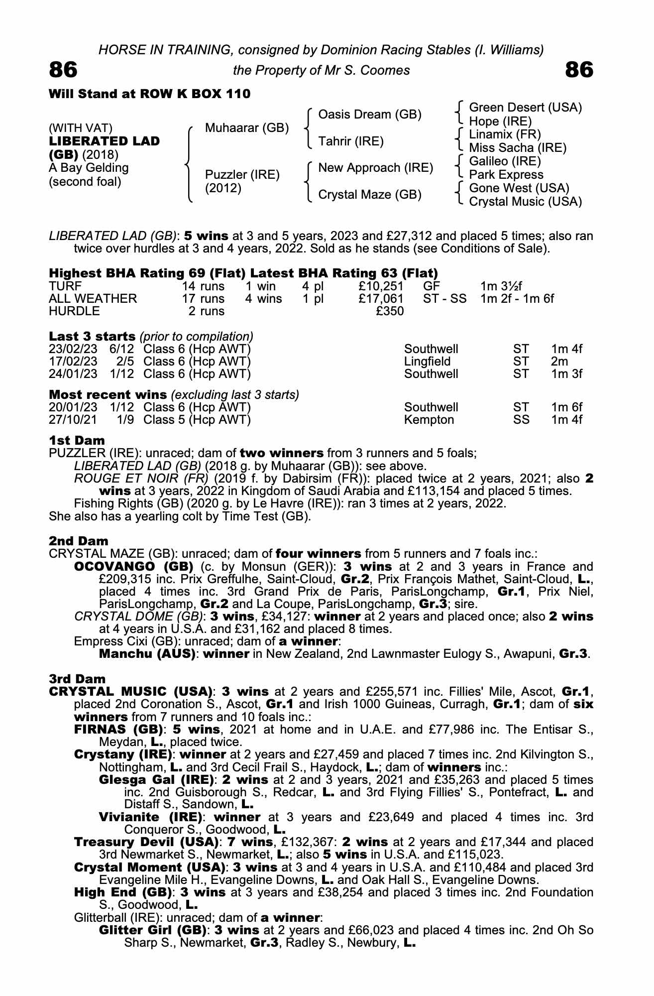 Consignor: Dominion Racing Stables (I. Williams)