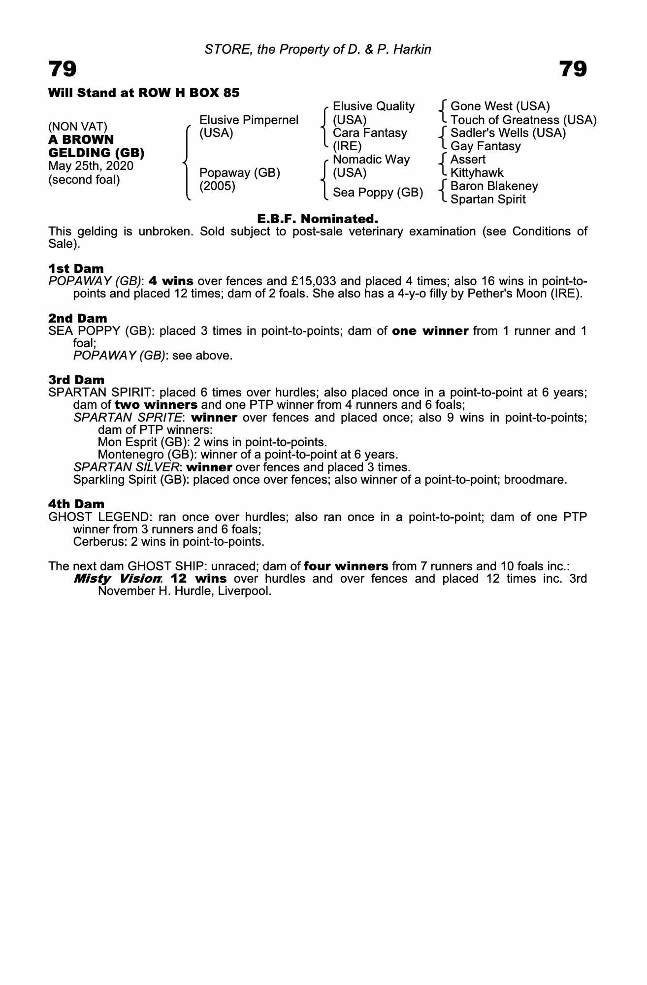 Vendor's Notes: This three year old store has been very well handled and is a lovely character. He has been lunged regularly and is ready to start work. He is very correct and has plenty of bone but is also very athletic. His dam, Popaway was the champion point to point and hunter chase mare for three seasons. She finished sound at thirteen after winning twenty races (including three at Cheltenham) and being placed fifteen times. She won by a total of 237 lengths and won at two miles, two and a half and three miles. His pedigree is very short as Popaway was an only foal, as was her dam and her granddam.