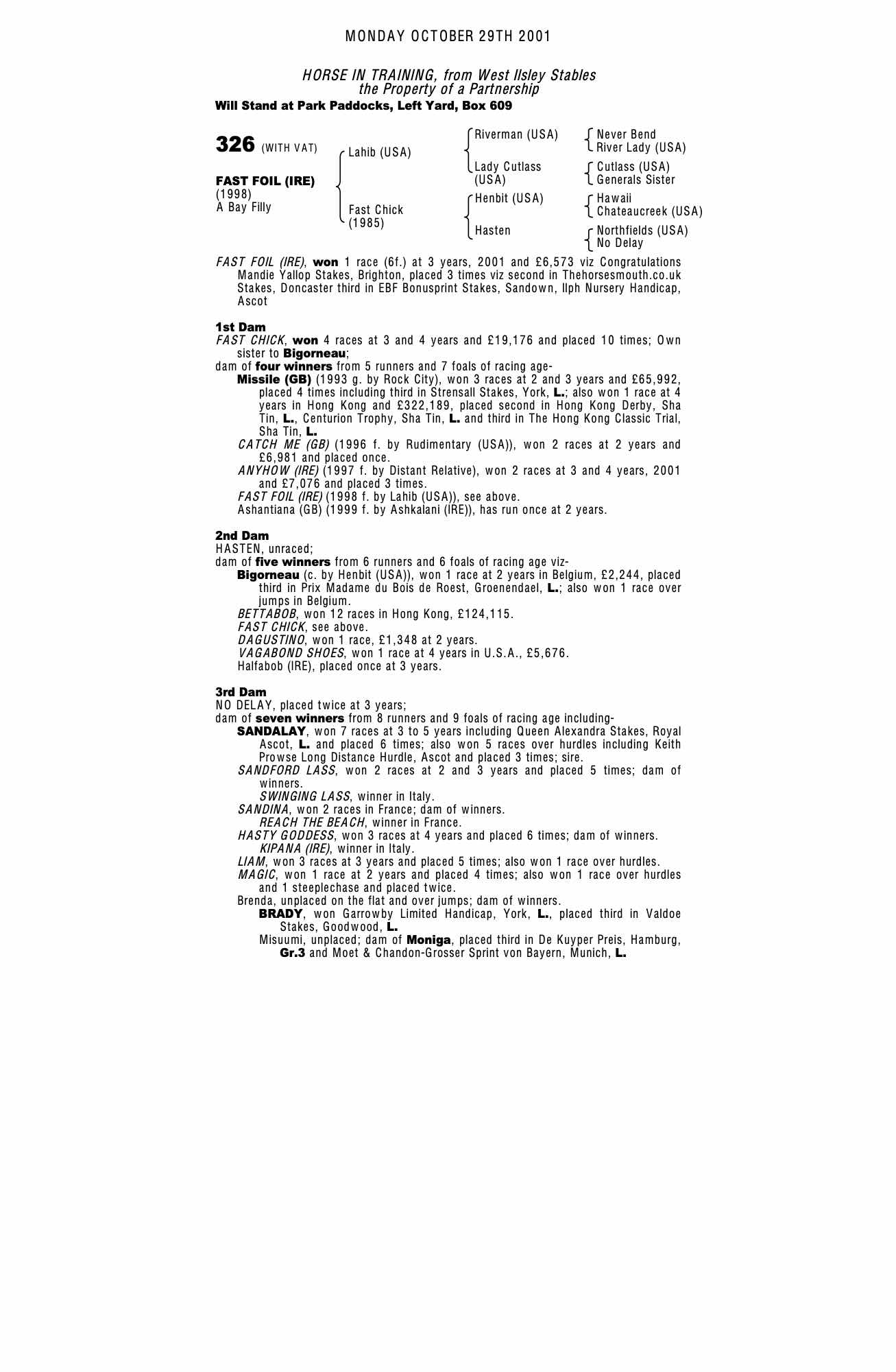 December Yearling Sale 2000 lot 126 F. by Ashkalani (IRE) , Trickledown Stud=>Lot Not Sold