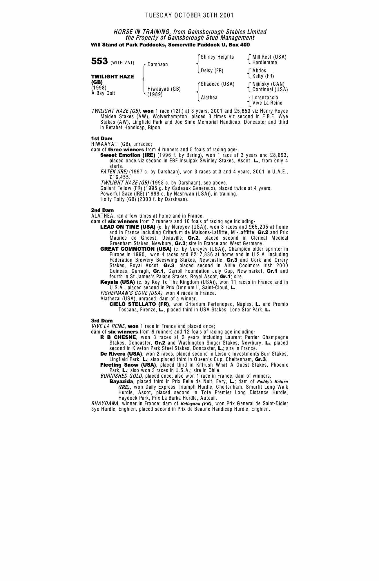 Autumn Horses in Training Sale 2001 lot 496 Powerful Gaze (IRE) (C. by Nashwan (USA)), Gainsborough Stables Limited=>Panayiotis Kastrinos 2,500 gns