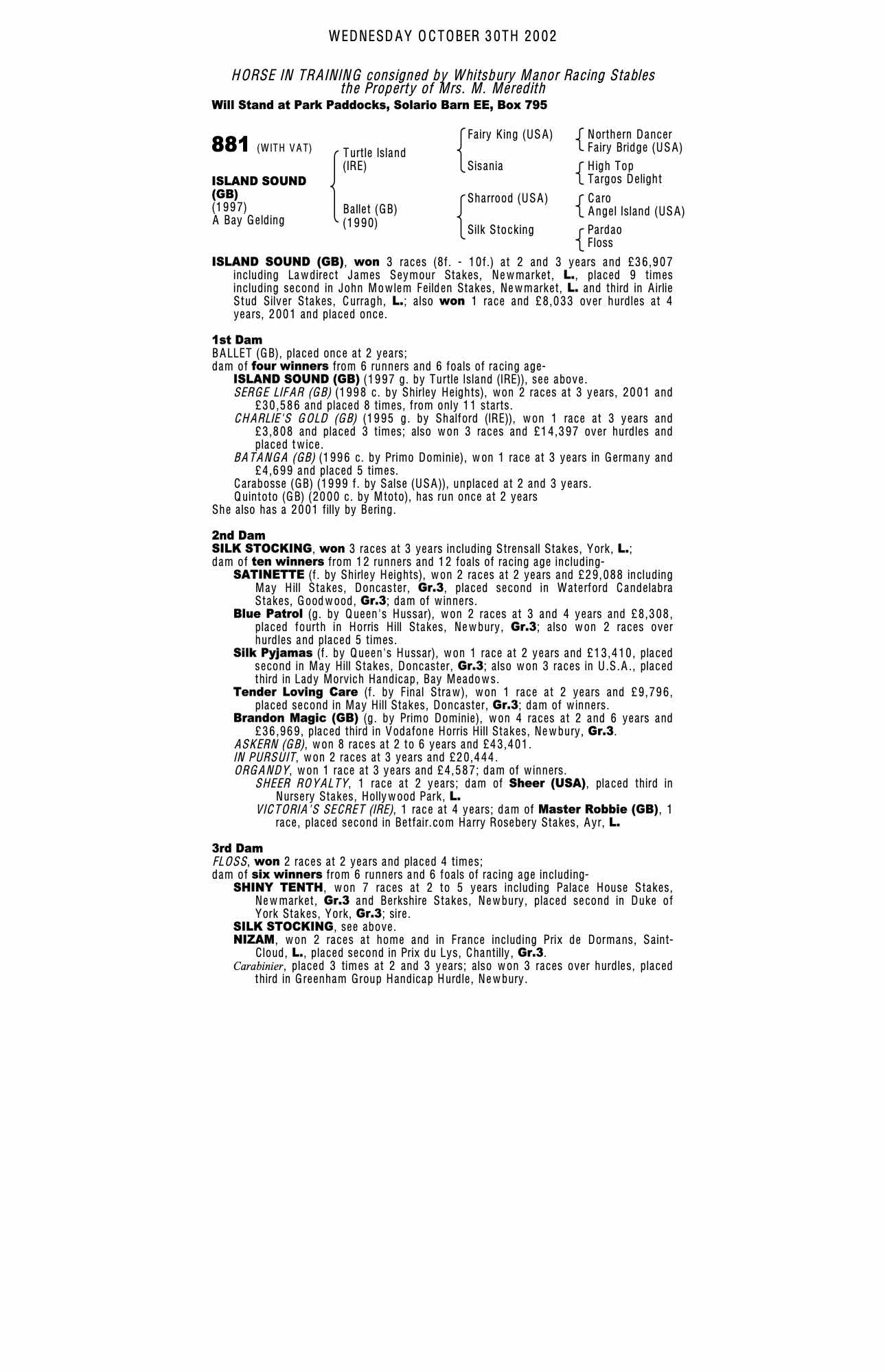 Autumn Horses in Training Sale 2001 lot 918 Serge Lifar (GB) (C. by Shirley Heights), East Everleigh Stables=>John McCormack Bloodstock 50,000 gns