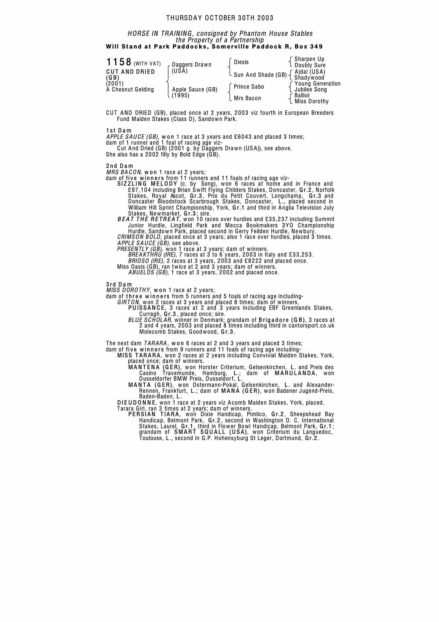 October Yearling Sale 2002 lot 903 C. 2001, Helescane Stud=>Maxine Cowdrey 34,000 gns