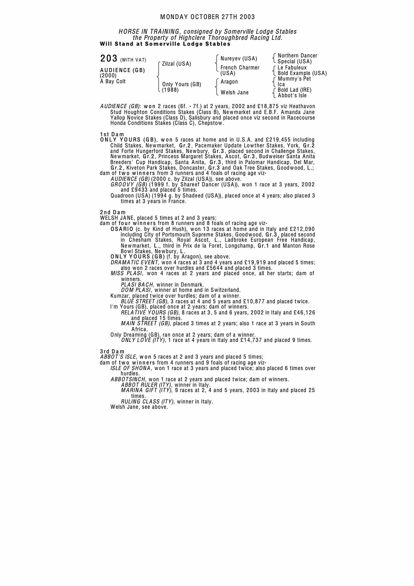 October Yearling Sale 2001 lot 453 C. , Whitsbury Manor Stud=>John Warren Bloodstock 82,000 gns