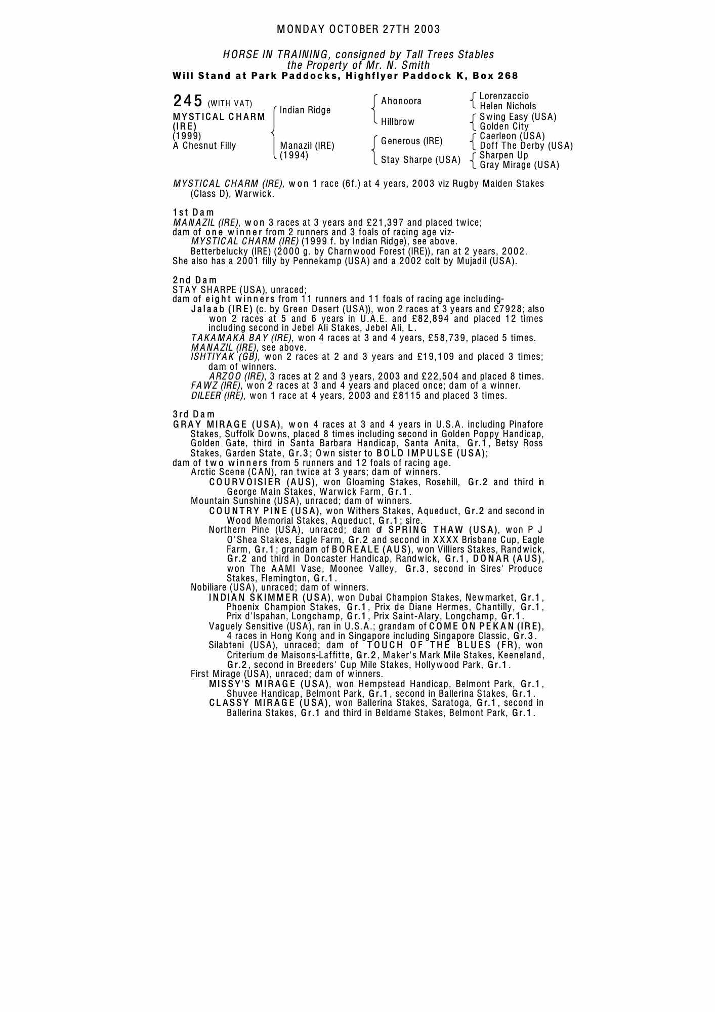 October Yearling Sale, Book 2 2004 lot 1965 F. by Indian Lodge (IRE) 2003, Caherass Stud, Ireland=>Kern/Lillingston Association 12,500 gns