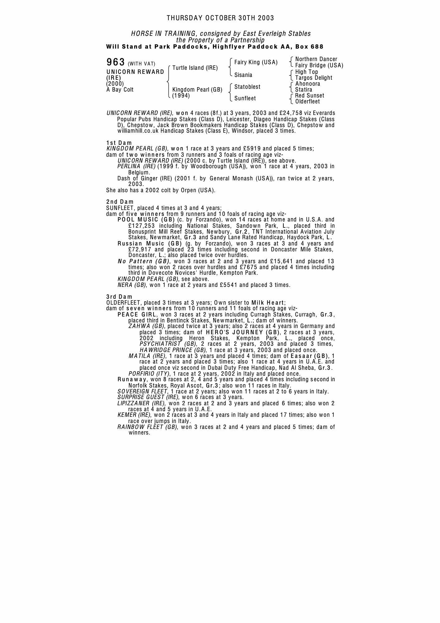 Autumn Horses in Training Sale 2001 lot 471 Perlina (IRE) (F. by Woodborough (USA)), Faringdon Place Stables=>F Sergeant 1,200 gns