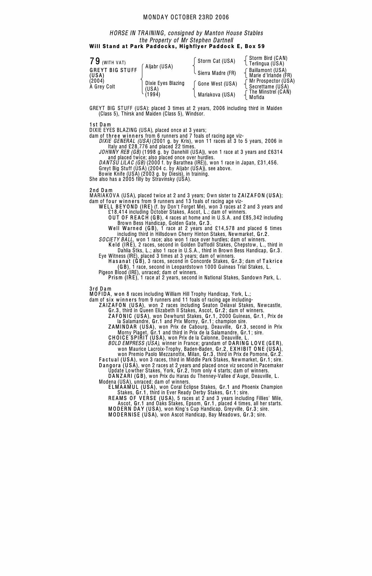 October Yearling Sale, Book 2 2006 lot 1311 F. by Stravinsky (USA) 2005, Jamie Railton, Agent=>Denis Coakley 13,000 gns
