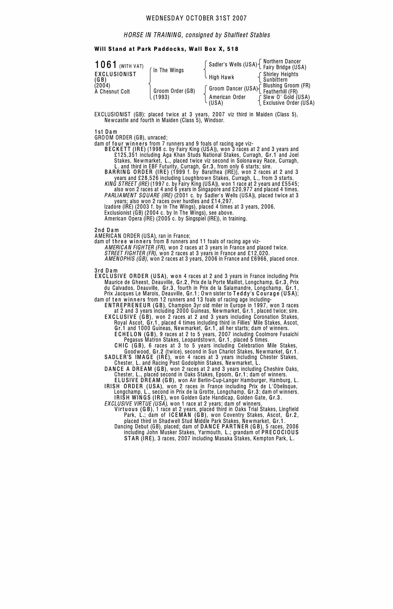 Houghton Yearling Sale 2001 lot 56 F. by Desert King (IRE) , Ballygallon Stud, Ireland=>Vendor 200,000 gns