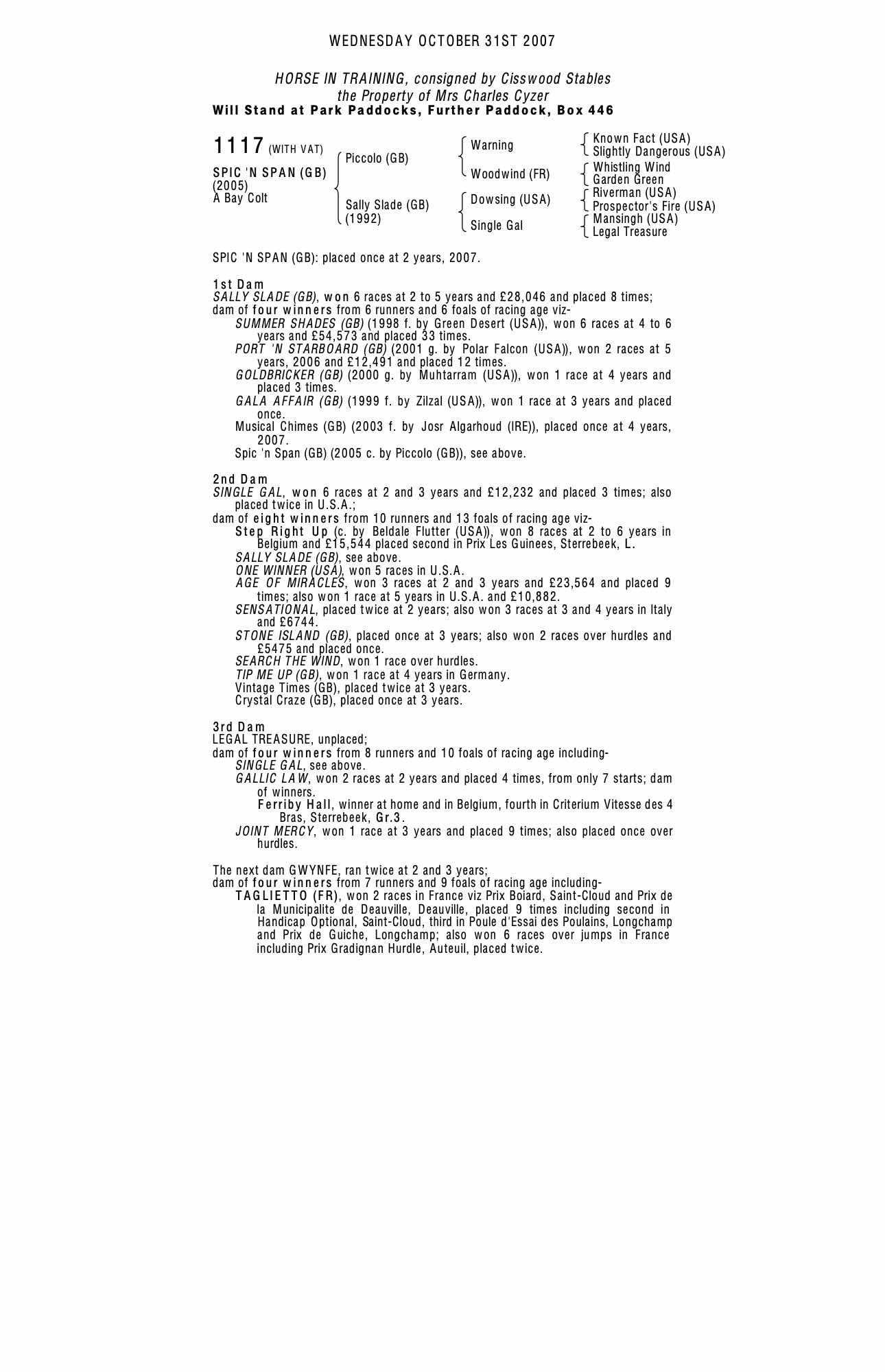 Autumn Horses in Training Sale 2007 lot 854 Port 'N Starboard (GB) (G. by Polar Falcon (USA)), Cisswood Stables=>Jose Francisco Acosta Lorenzo 1,000 gns