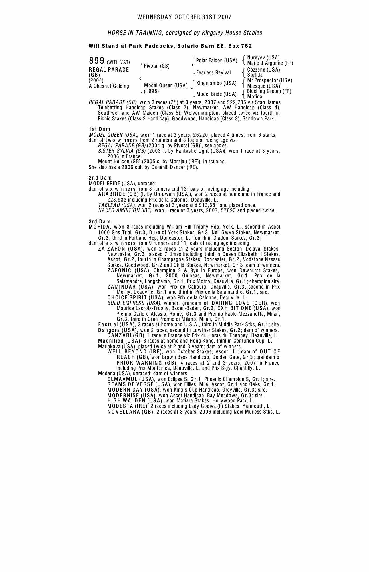 October Yearling Sale, Book 1 2004 lot 321 F. by Fantastic Light (USA) 2003, Jockey Hall Stud, Ireland (Agent)=>Lot Not Sold 38,000 gns