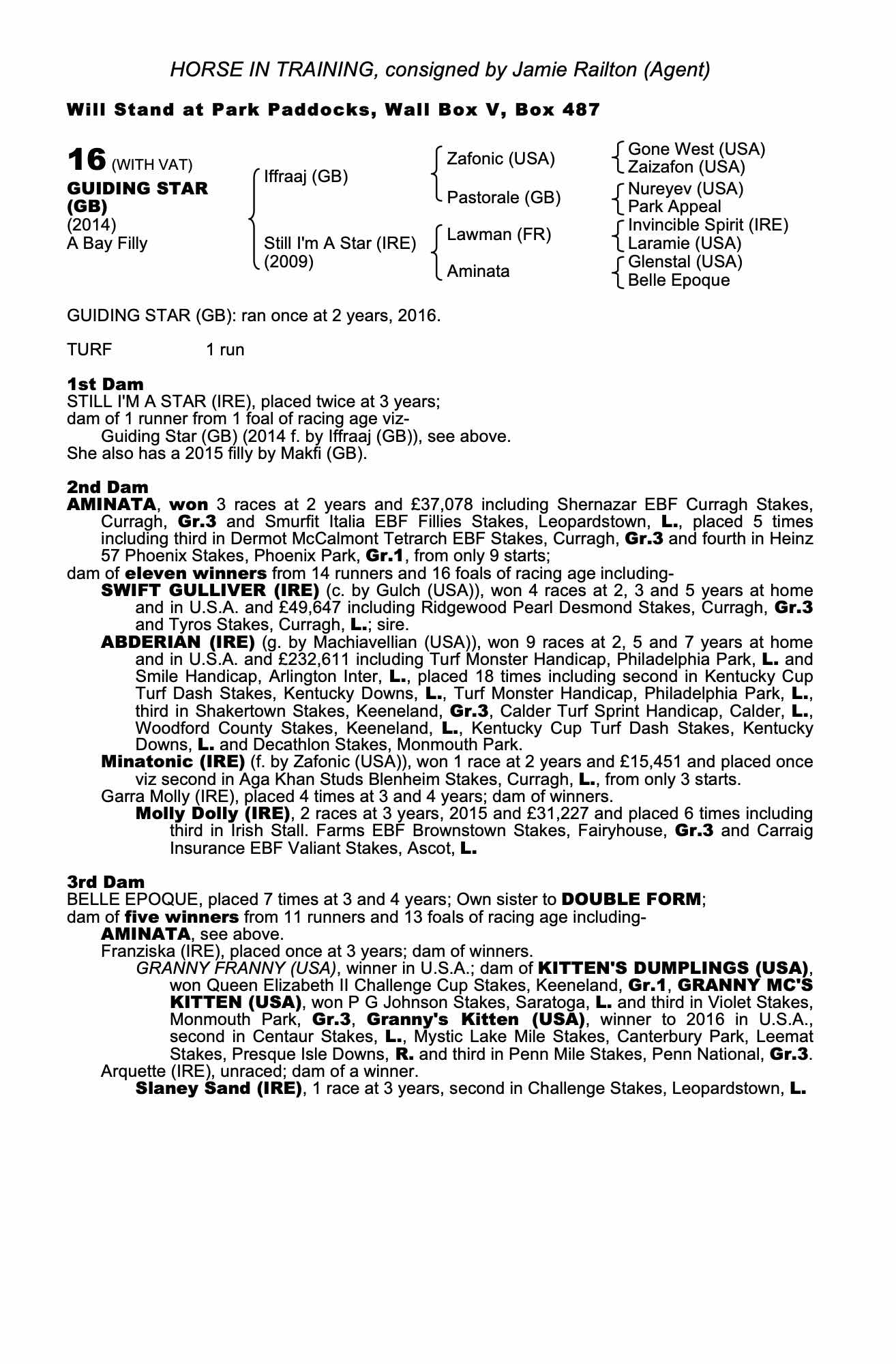 GUIDING STAR (GB), placed once at 2 years, 2016 viz 4th Cl 5 Fillies Maiden Stakes 6f Kempton.
