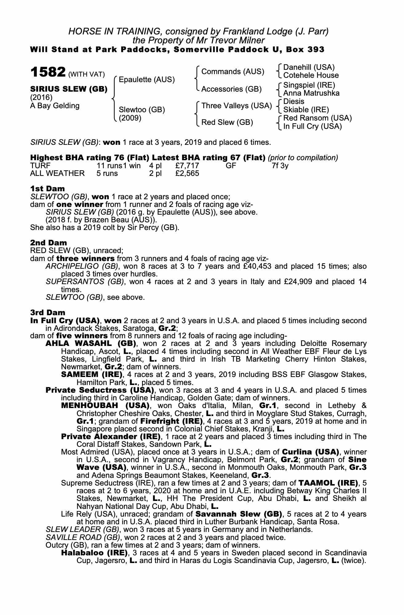 Consignor: Frankland Lodge (J. Parr)