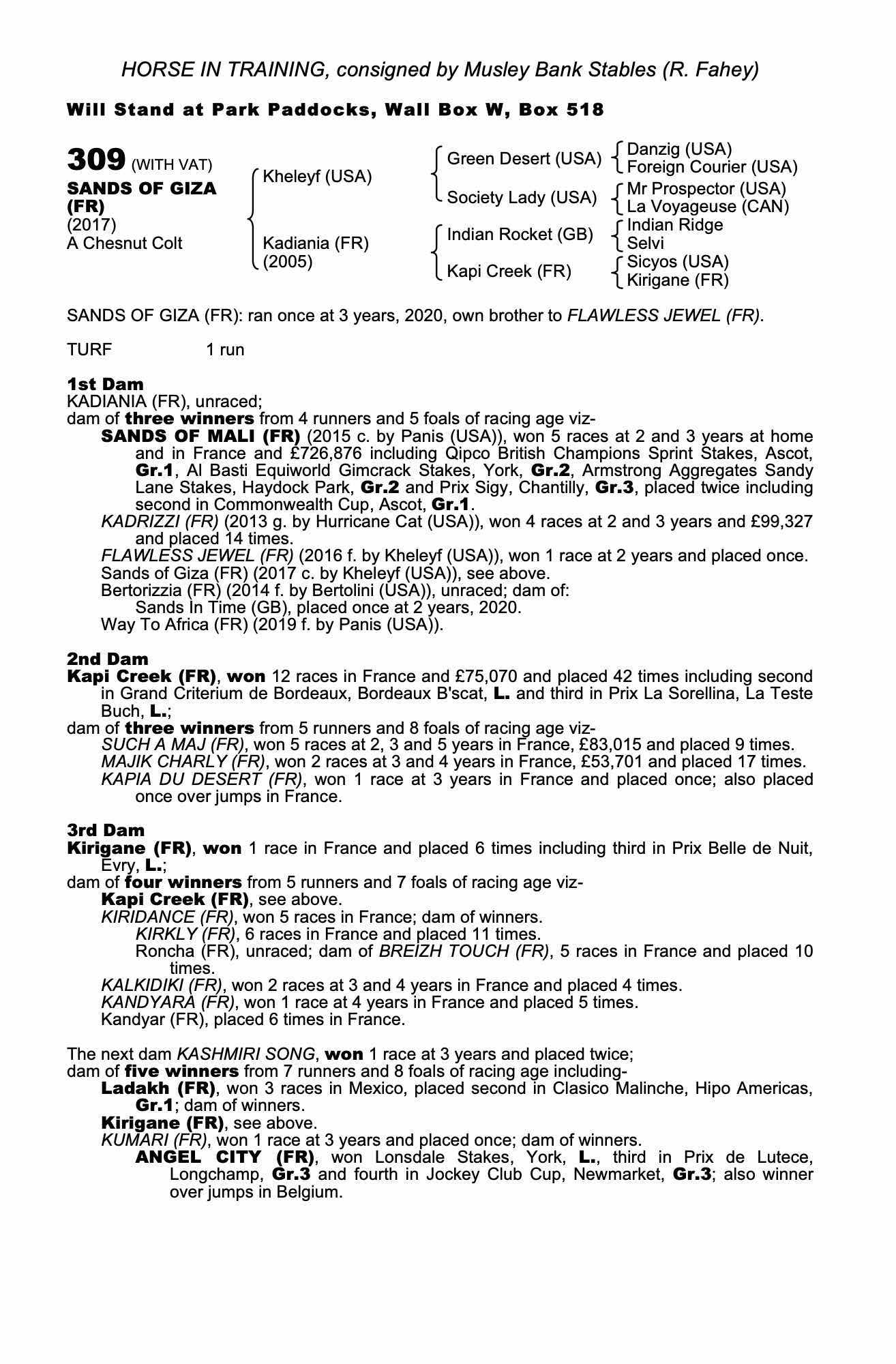Online Sale - 11th December 2025 lot 135 A Breeding Right to Sands of Mali (FR) (H. by Panis (USA)), a Partnership