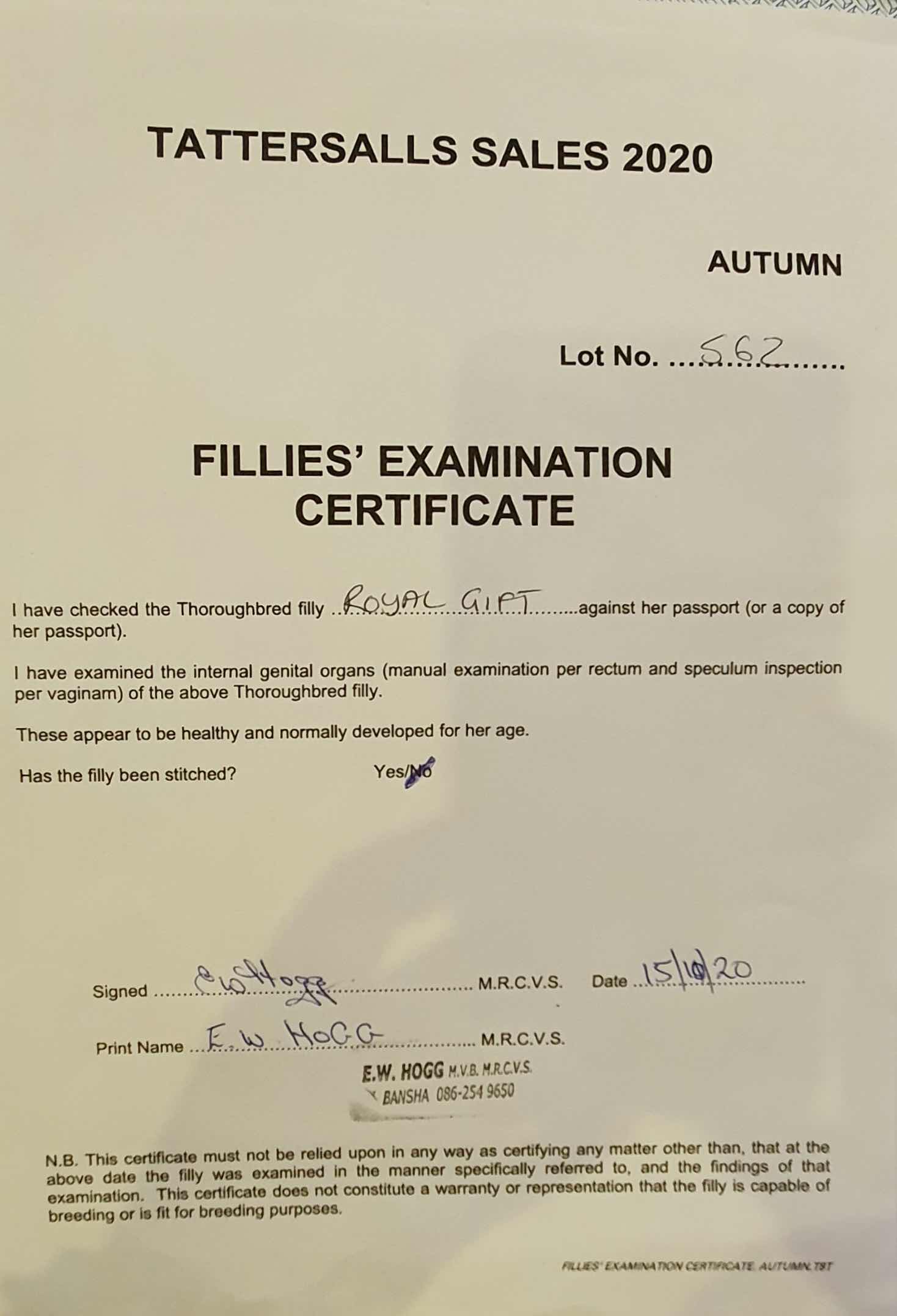 Fillies Examination Cert
