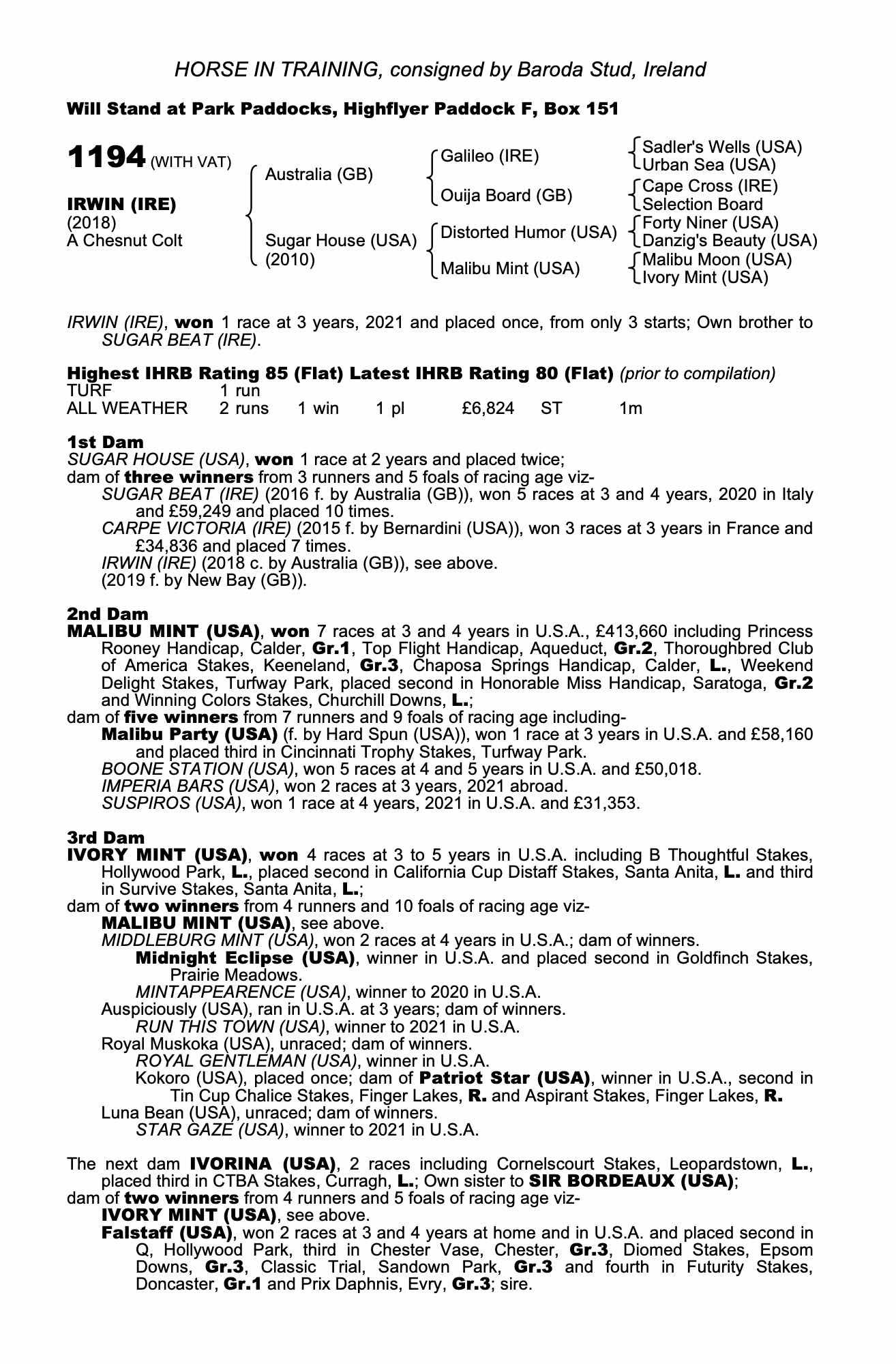 Online Sale - 25th October 2024 lot 160 Sugar Beat (IRE) (M.), Whitsbury Manor Stud=>Ravenswood 11,500 gns