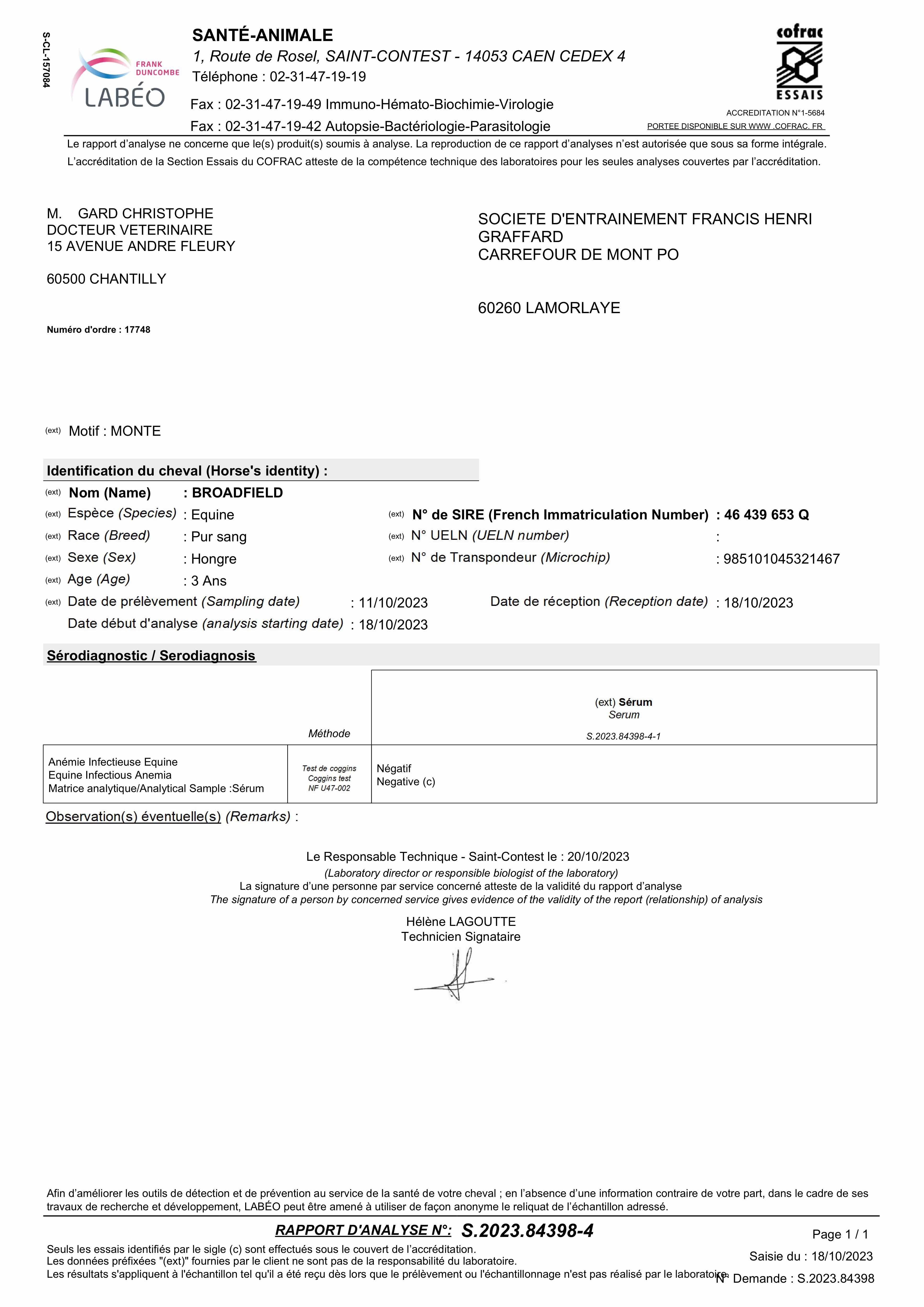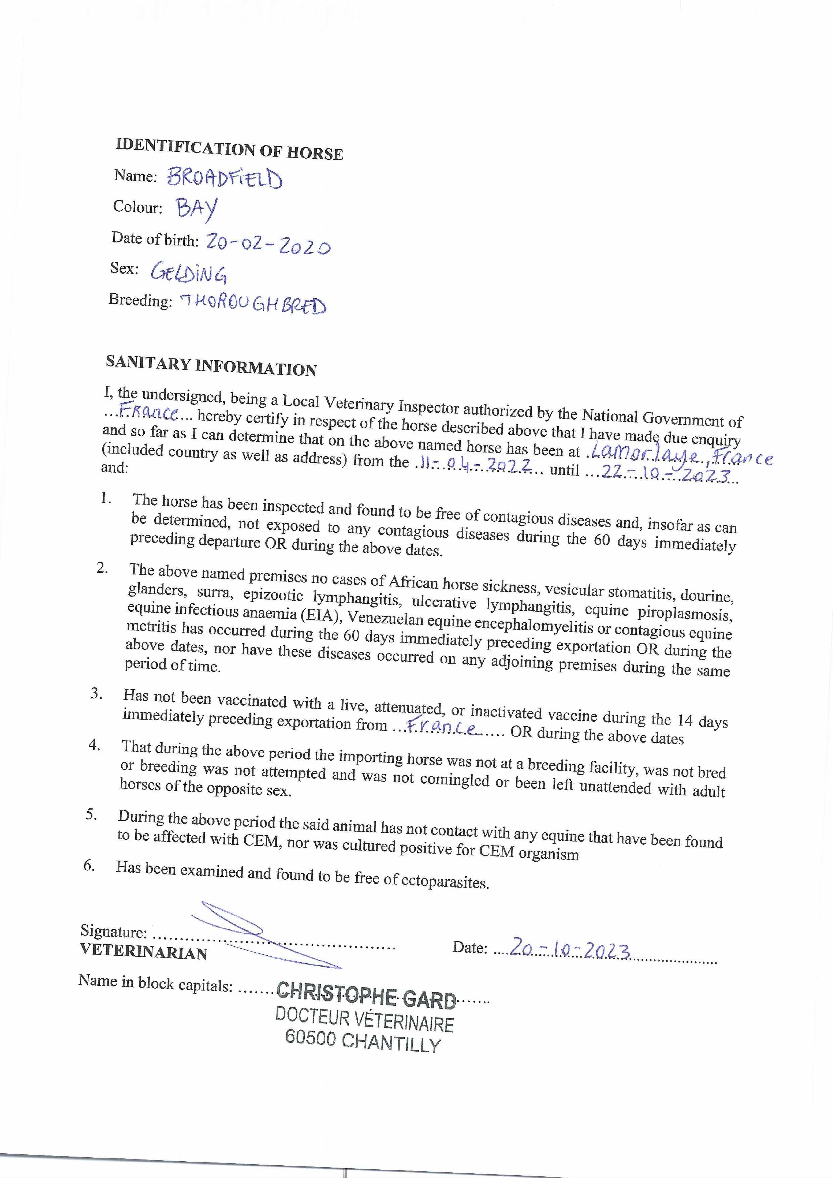 Thursday 19 October: BROADFIELD (GB), now ran 4 times.