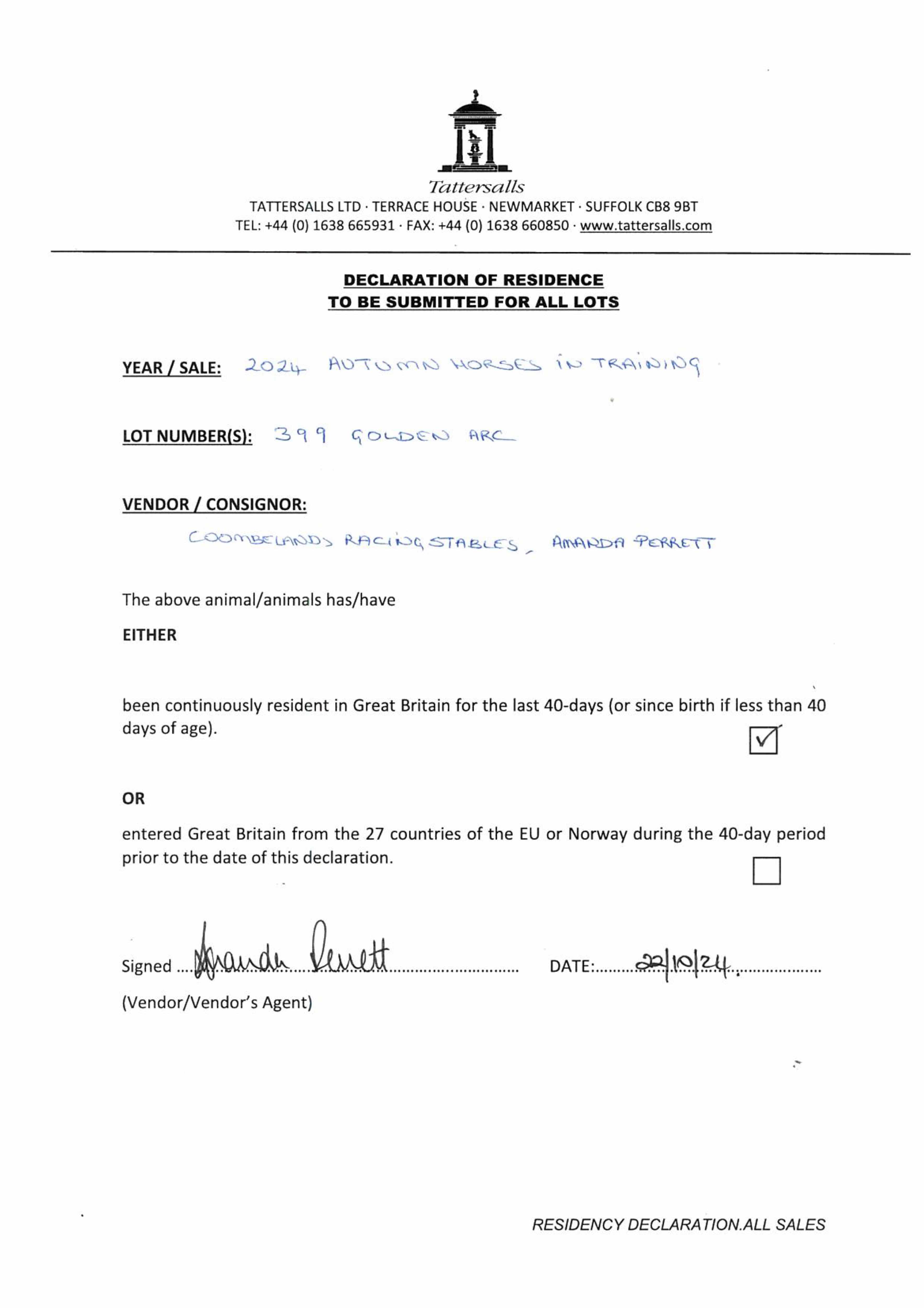 Consignor: Coombelands Racing Stables (Mrs A. Perrett)