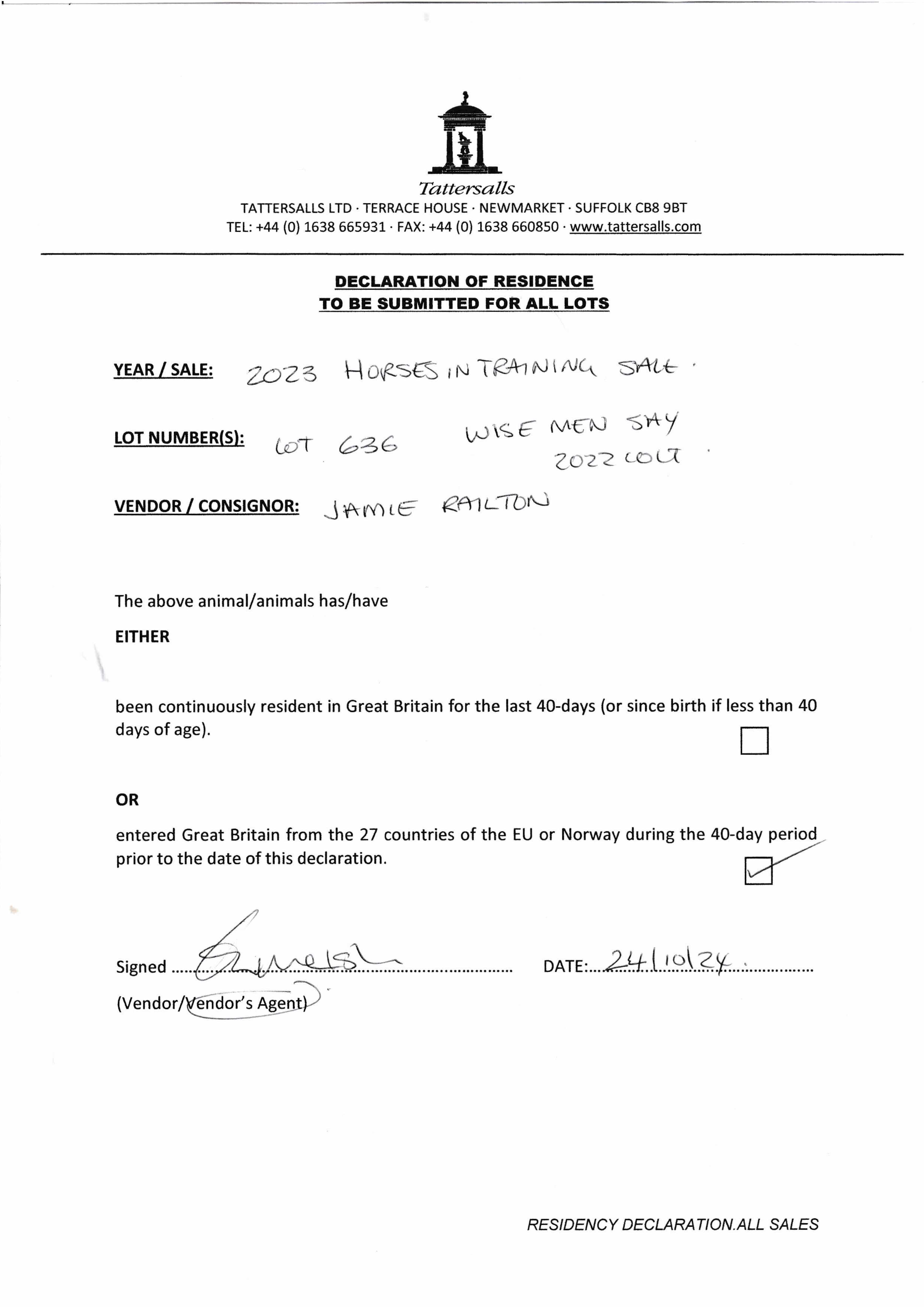 Consignor: Jamie Railton (Agent)