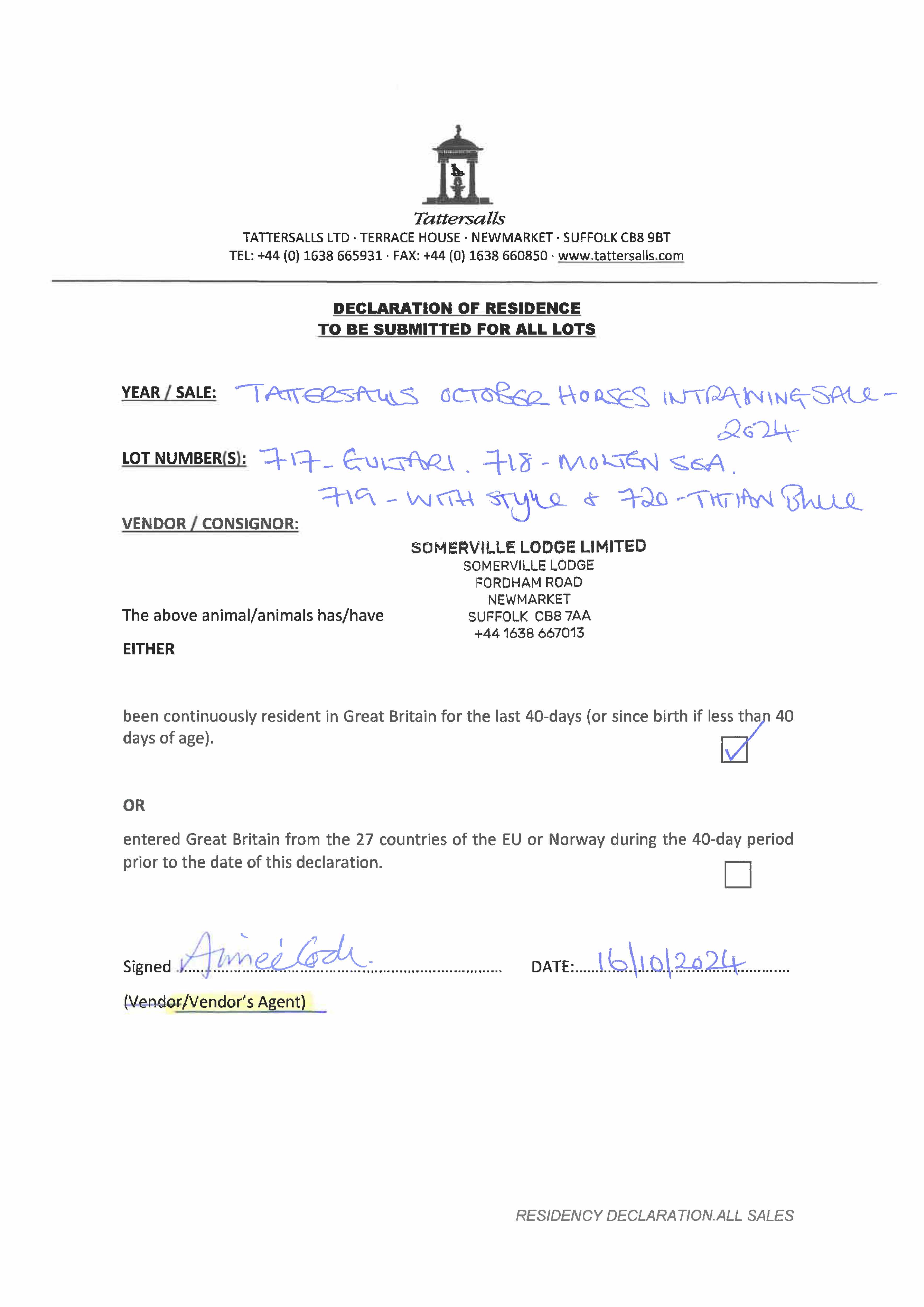 Consignor: Somerville Lodge Ltd. (W. Haggas), Agent