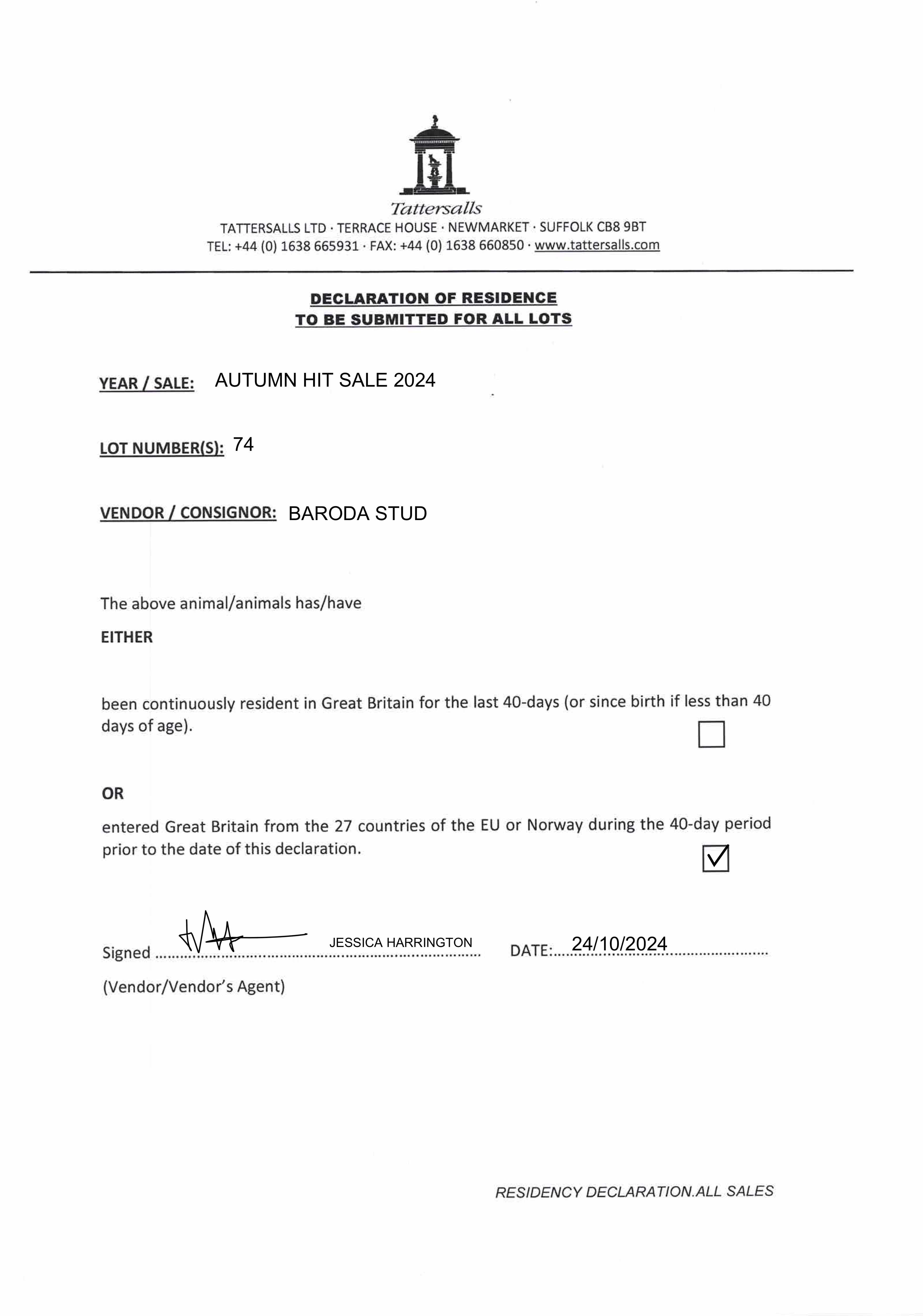 Consignor: Baroda Stud, Ireland