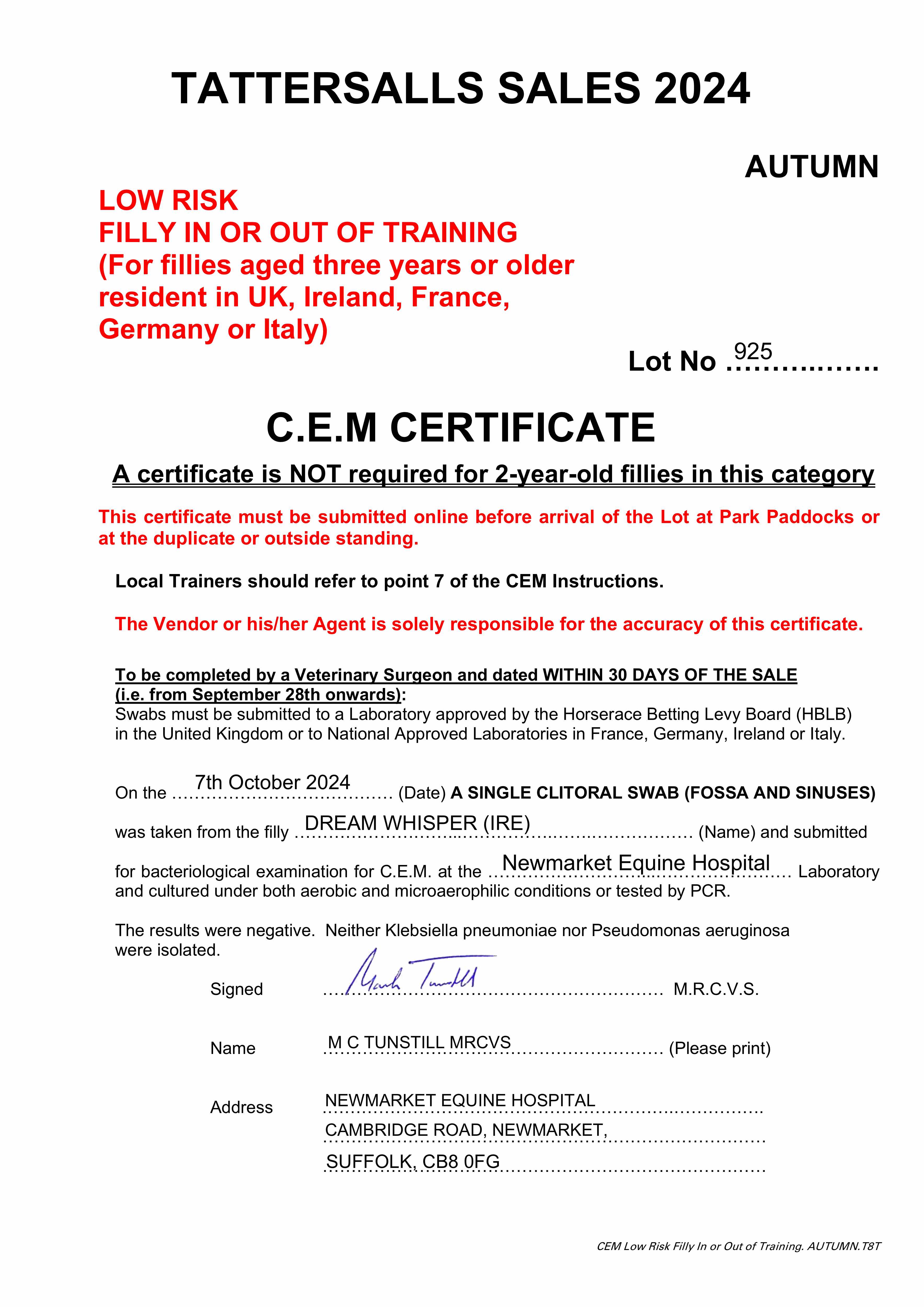 Fillies Examination Cert