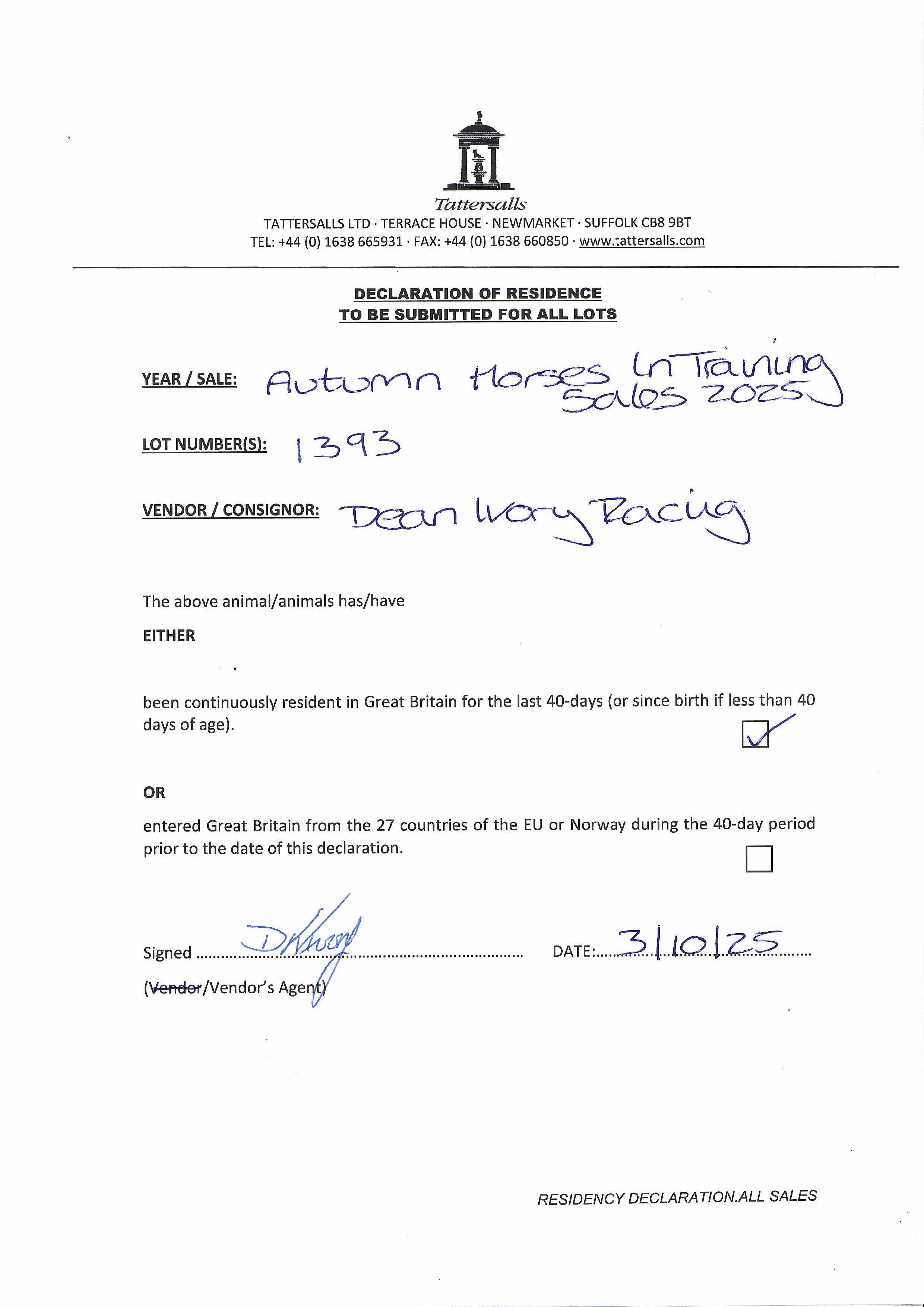 October Yearling Sale, Book 3 2025 lot 1524 F. by Space Blues (IRE) 2024, Corduff Stud, Ireland=>Hurworth Bloodstock 10,000 gns