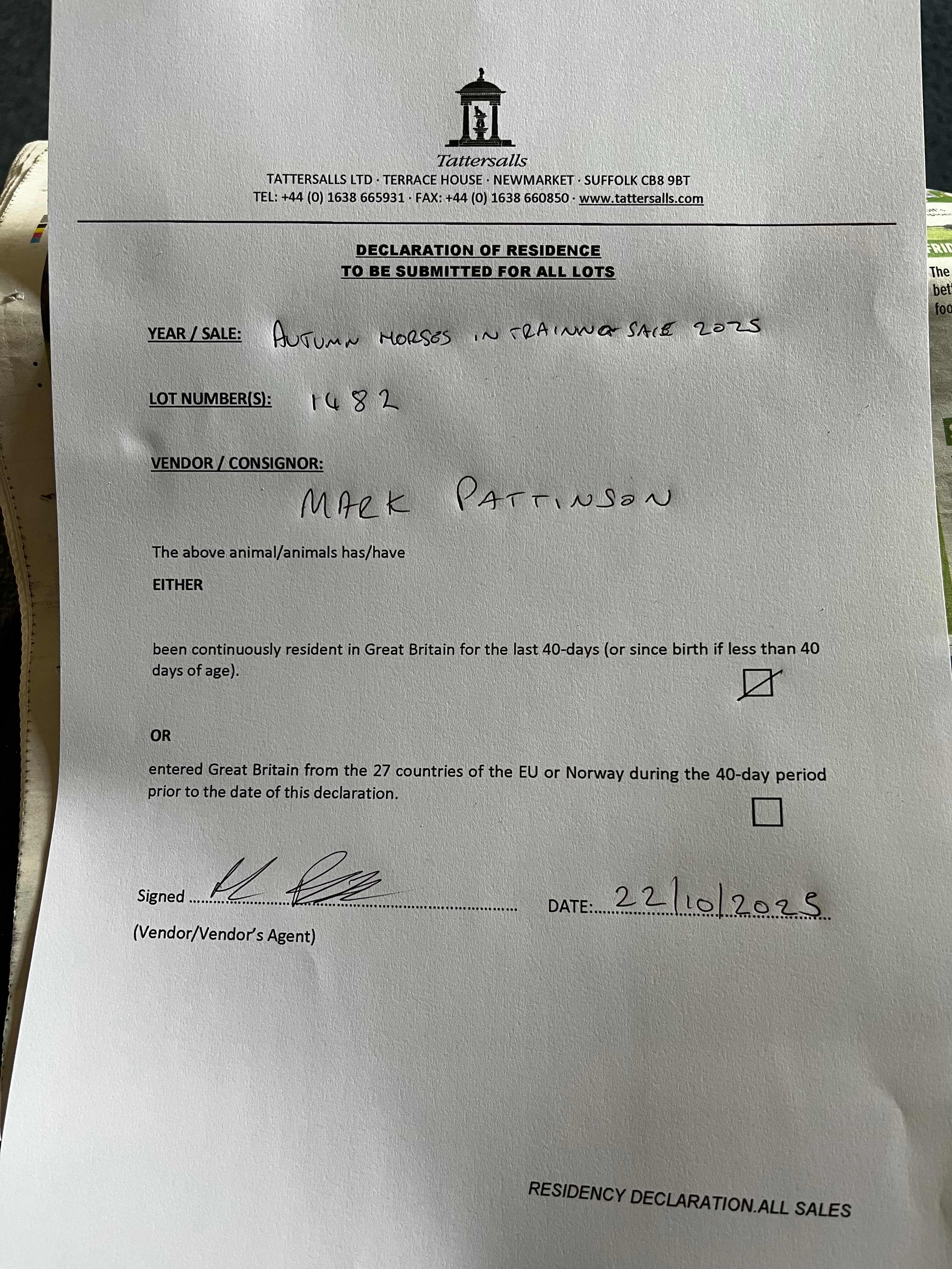 August Sale 2023 lot 133, Jamie Railton (Agent)=>Mark Pattinson 12,000 gns