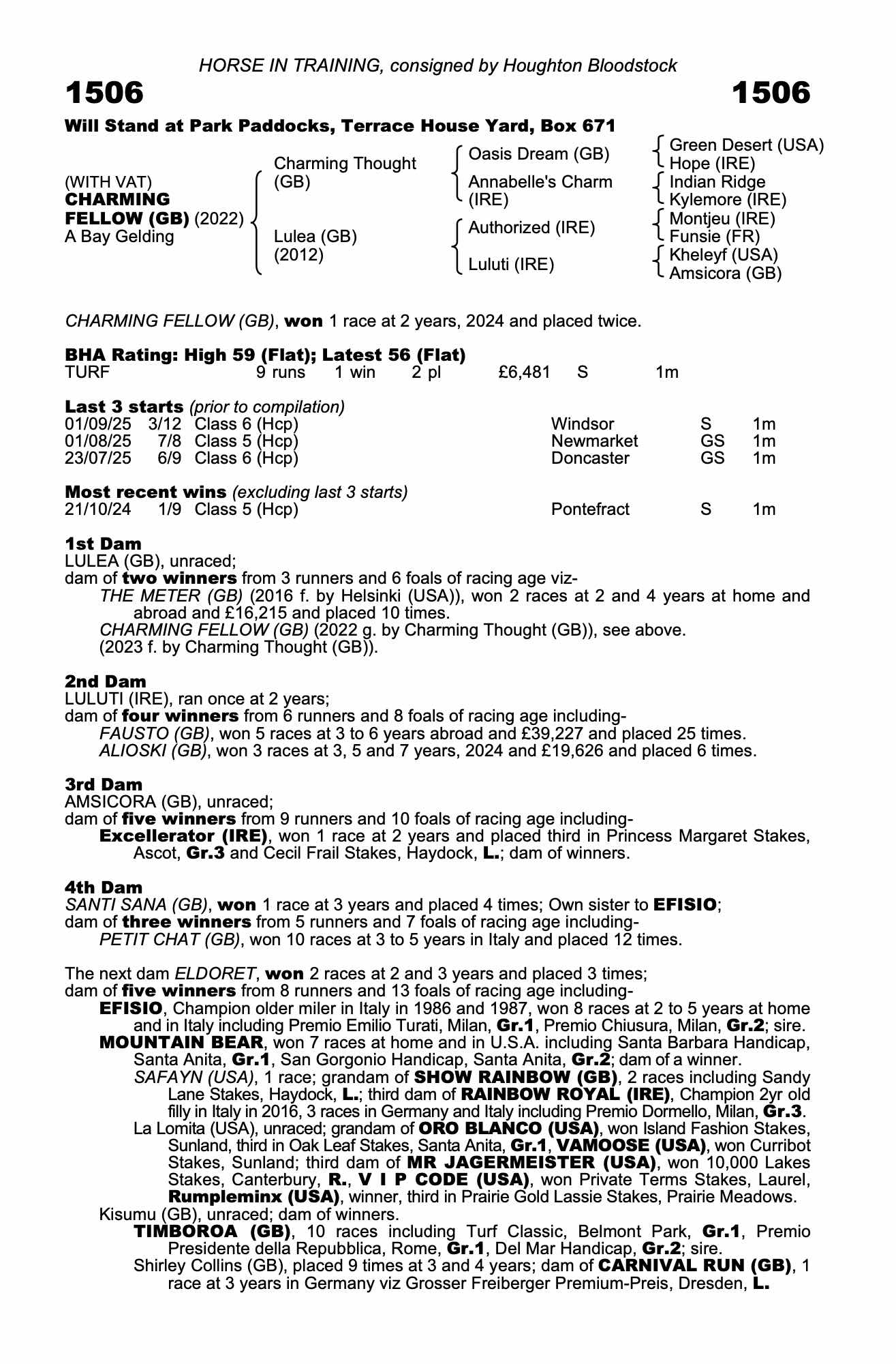 BHA Rating: High 59 (Flat); Latest 59 (Flat)23/09/25 – 2nd of 9 in 1m ½f Class 6 (Hcp), Beverley (S)