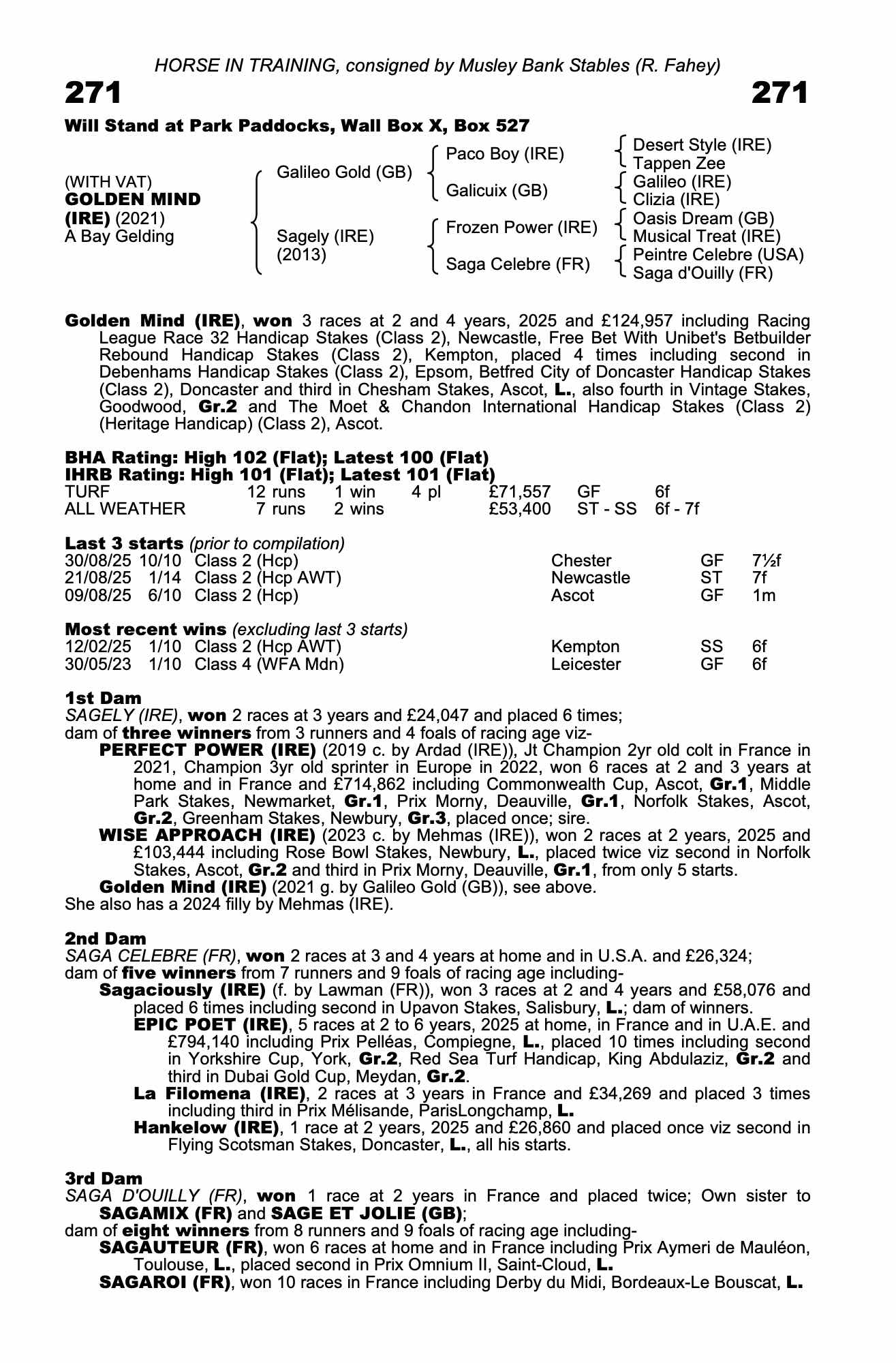 Tuesday 21 October:  Under 2nd dam, Sagaciously (IRE), dam of: HANKELOW (IRE), 2 races at 2 years, 2025 and £63,722 including Autumn Stakes, Newmarket, Gr.3.