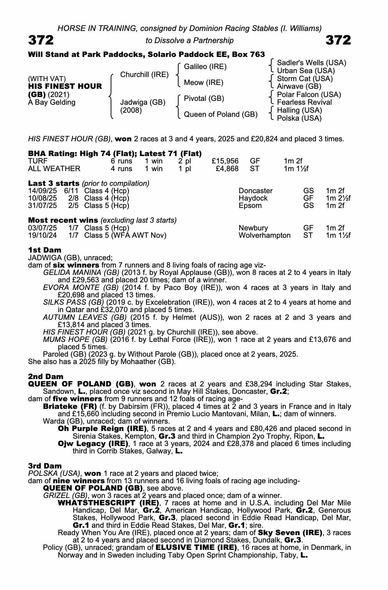 Consignor: Dominion Racing Stables (I. Williams)