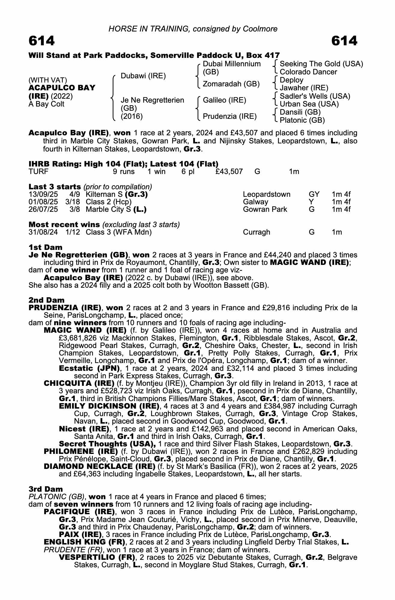 Under 2nd dam: DIAMOND NECKLACE (IRE) (f. by St Mark's Basilica (FR)), won 3 races at 2 years, 2025 at home and in France and £253,256 including Prix Marcel Boussac, ParisLongchamp, Gr.1, all her starts.