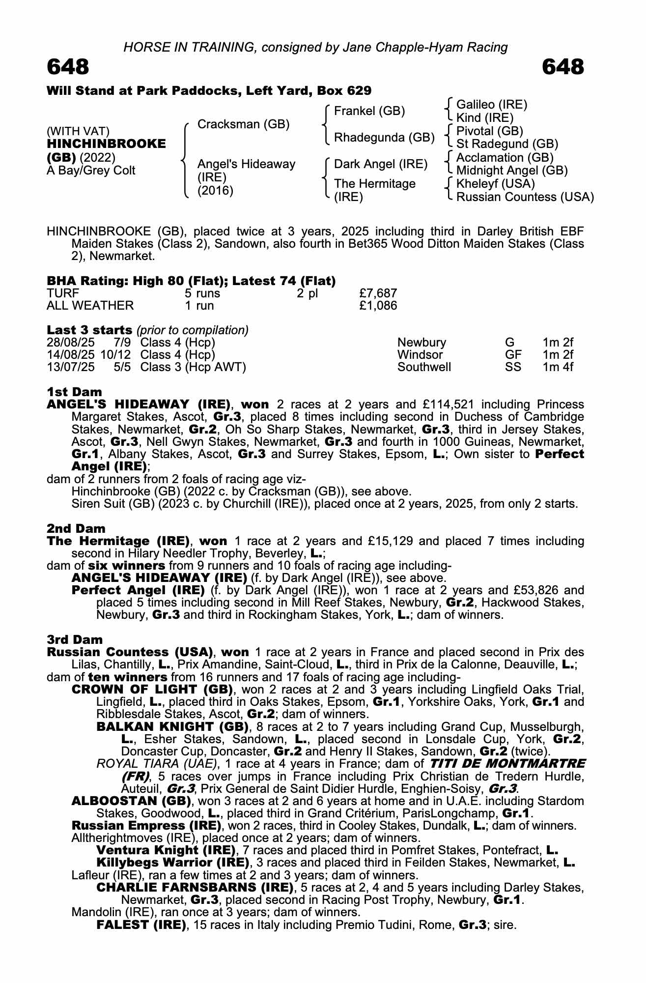 HINCHINBROOKE (GB), placed 3 times at 3 years, 2025 and £11,573.