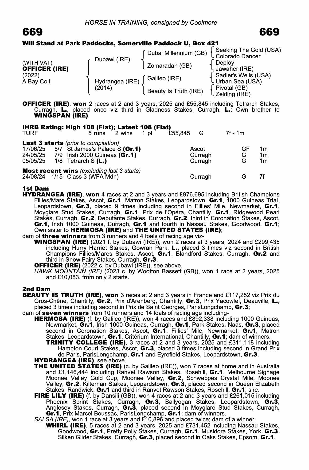Half brother: HAWK MOUNTAIN (IRE) (2023 c. by Wootton Bassett (GB)), won 3 races at 2 years, 2025 and £182,015 including Futurity Trophy Stakes, Doncaster, Gr.1 and Beresford Stakes, Curragh, Gr.2, from only 4 starts.