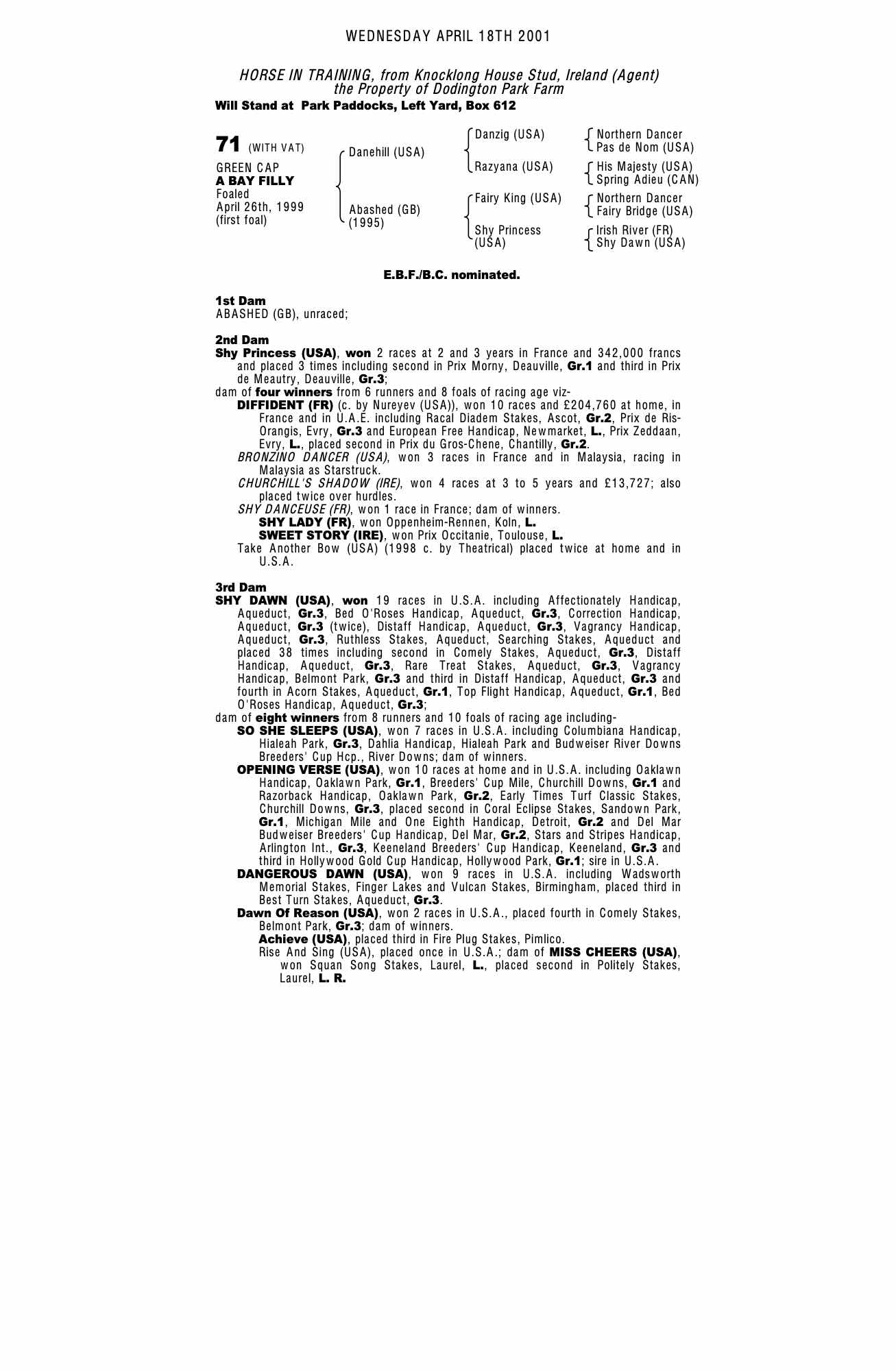 December Foal Sale 1999 lot 1027 F. , Seskin Stud, Ireland (Agent)=>Dodington Park Farm 6,000 gns