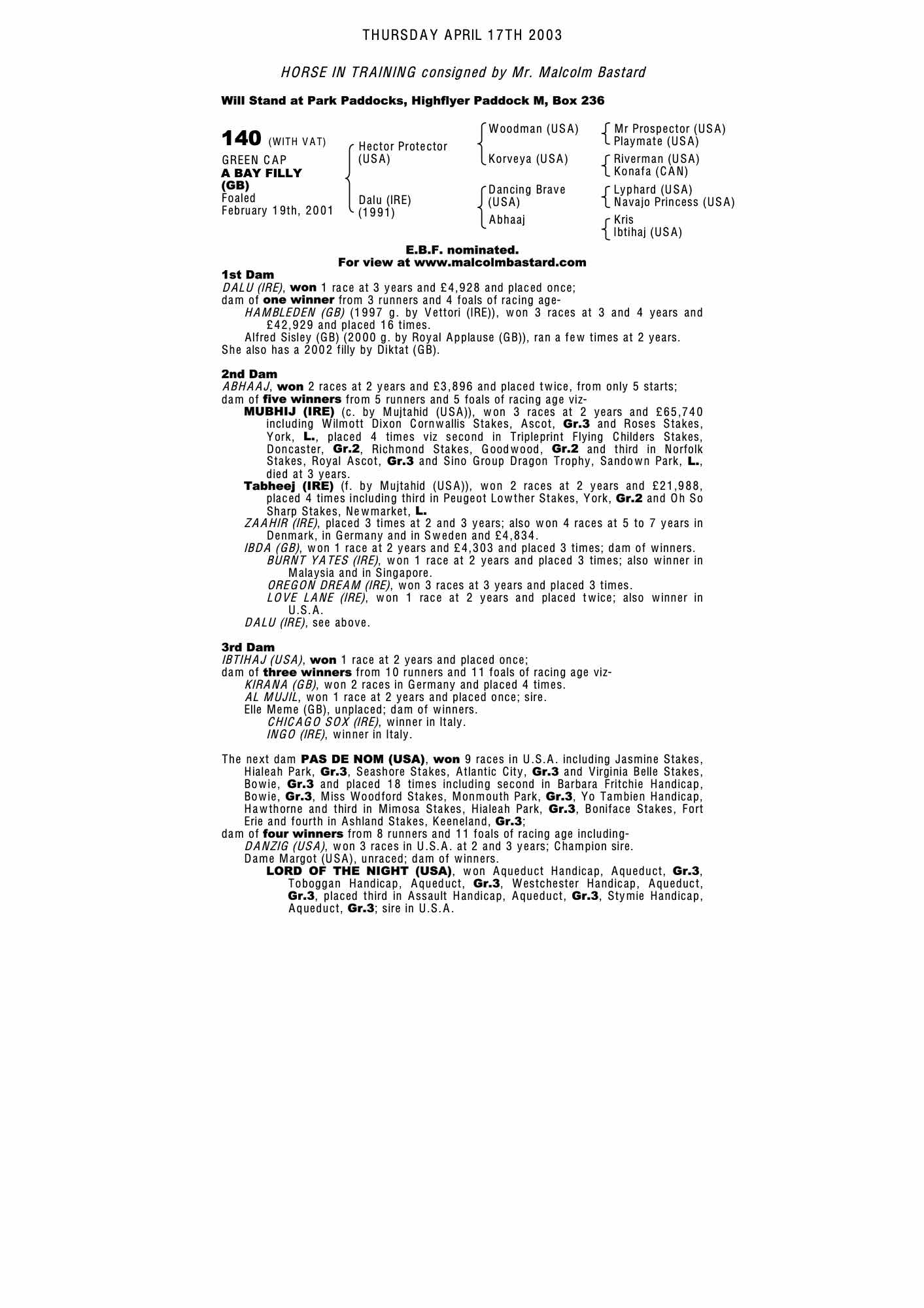 December Mare Sale 2001 lot 2280 Pagan Princess (GB) (F. by Mujtahid (USA)), Eve Lodge Stables=>Lot Not Sold