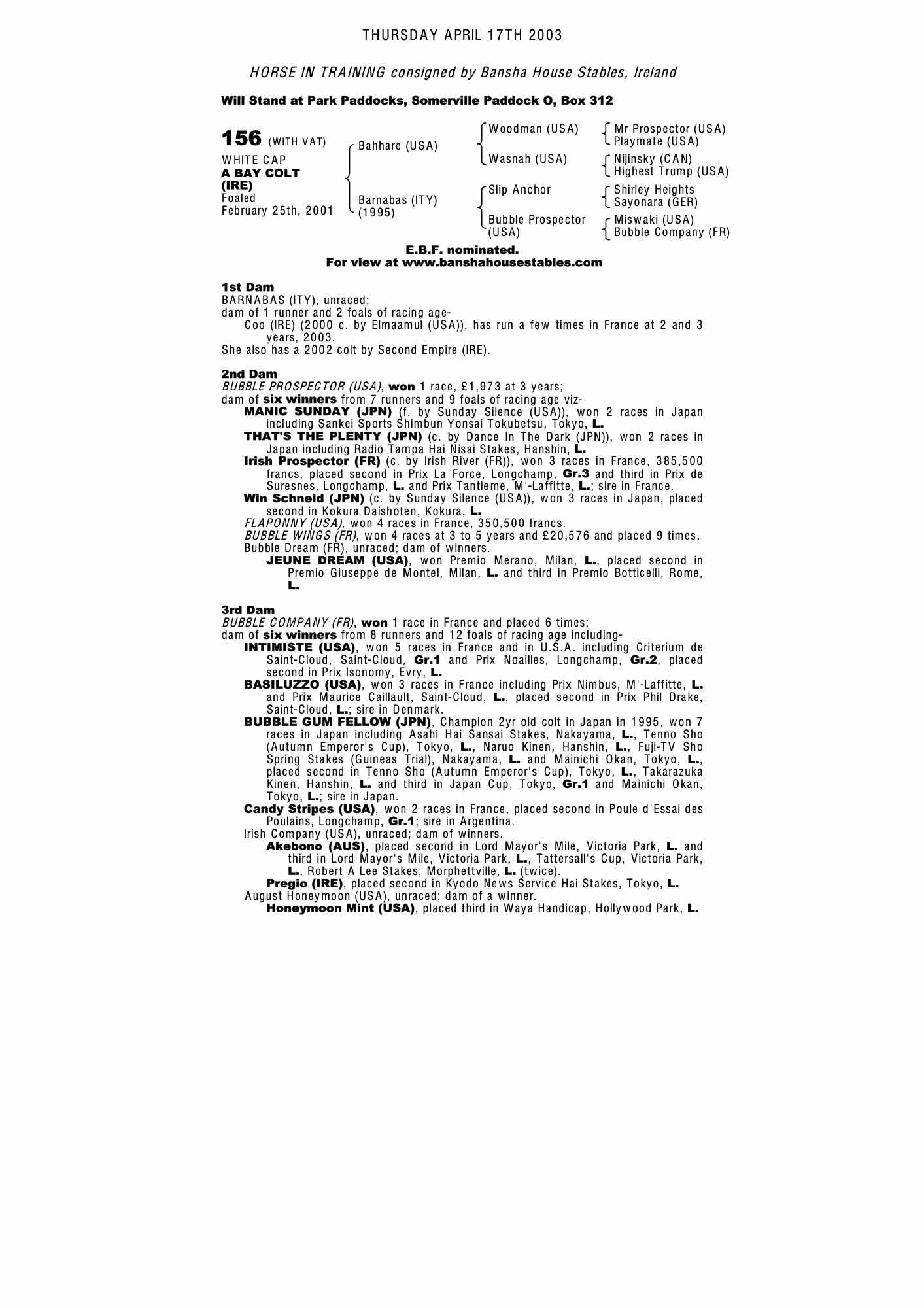 September Yearling Sale 2003 lot 432 C. by Second Empire (IRE) 2002, Soolmoy Stud=>Mark Tompkins €7,000