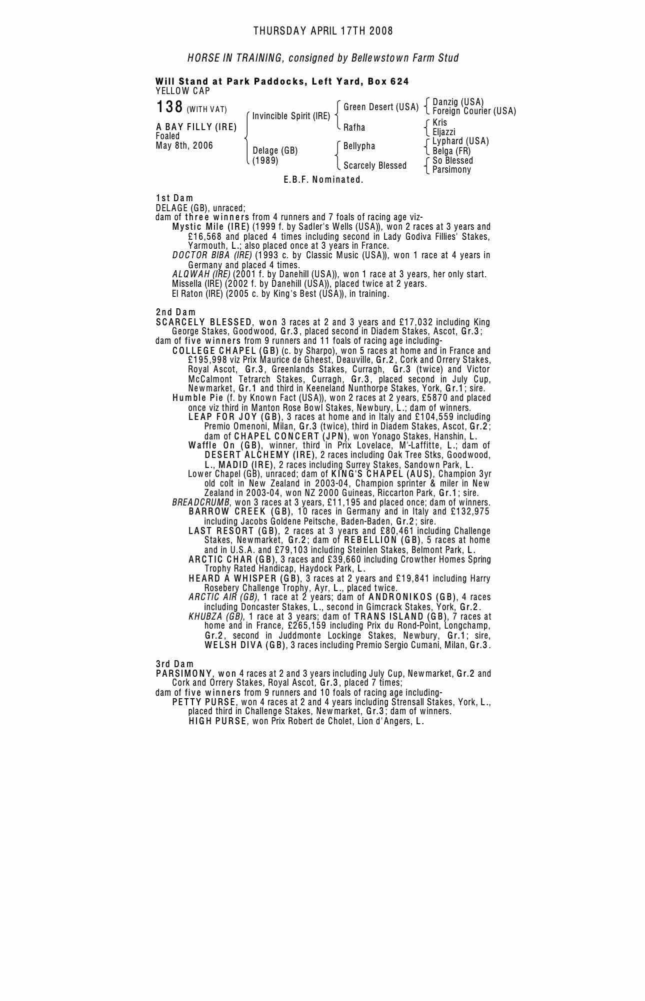 Consignor: Bellewstown Farm Stud