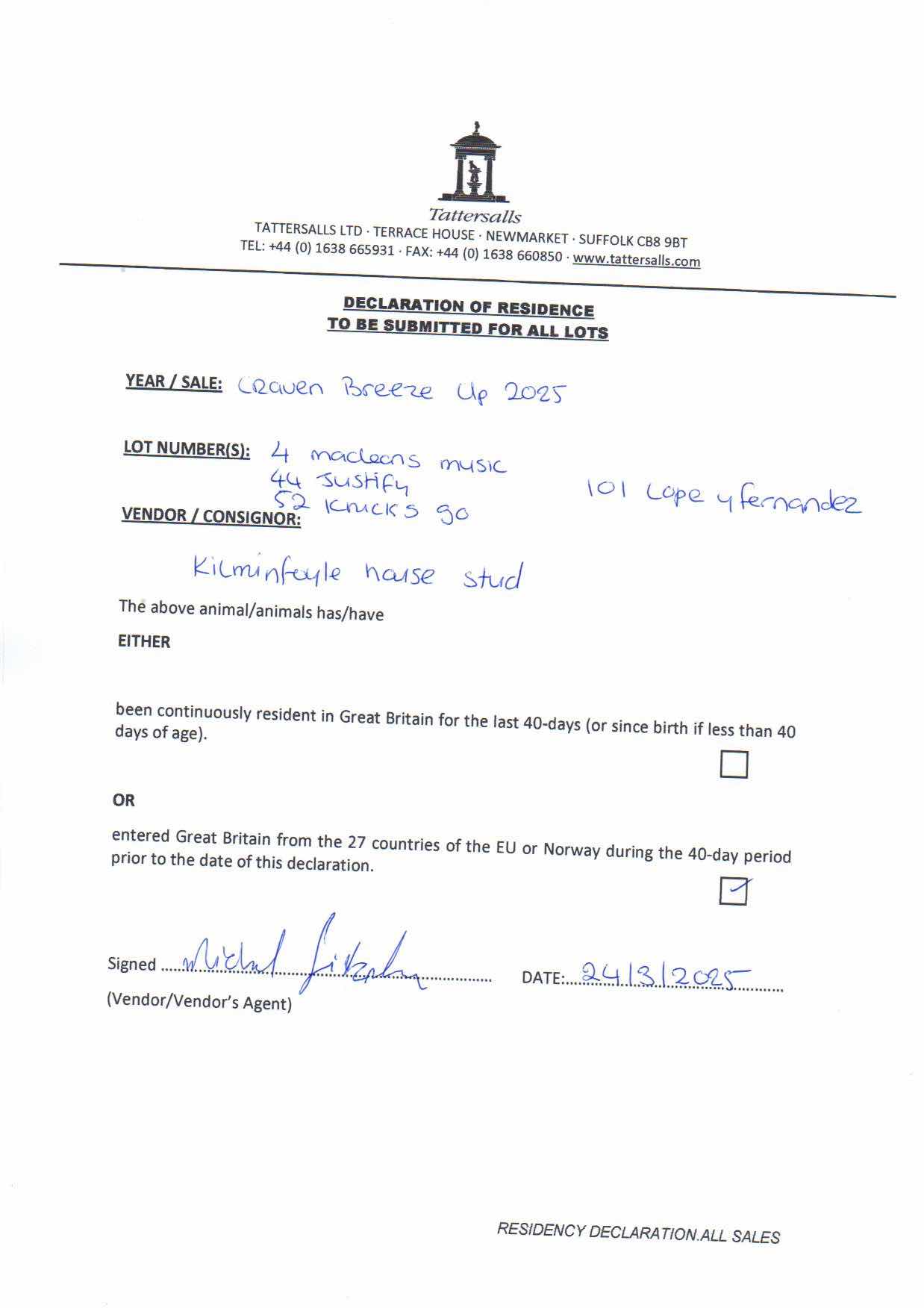 Kilminfoyle House Stud, Ireland (Agent)