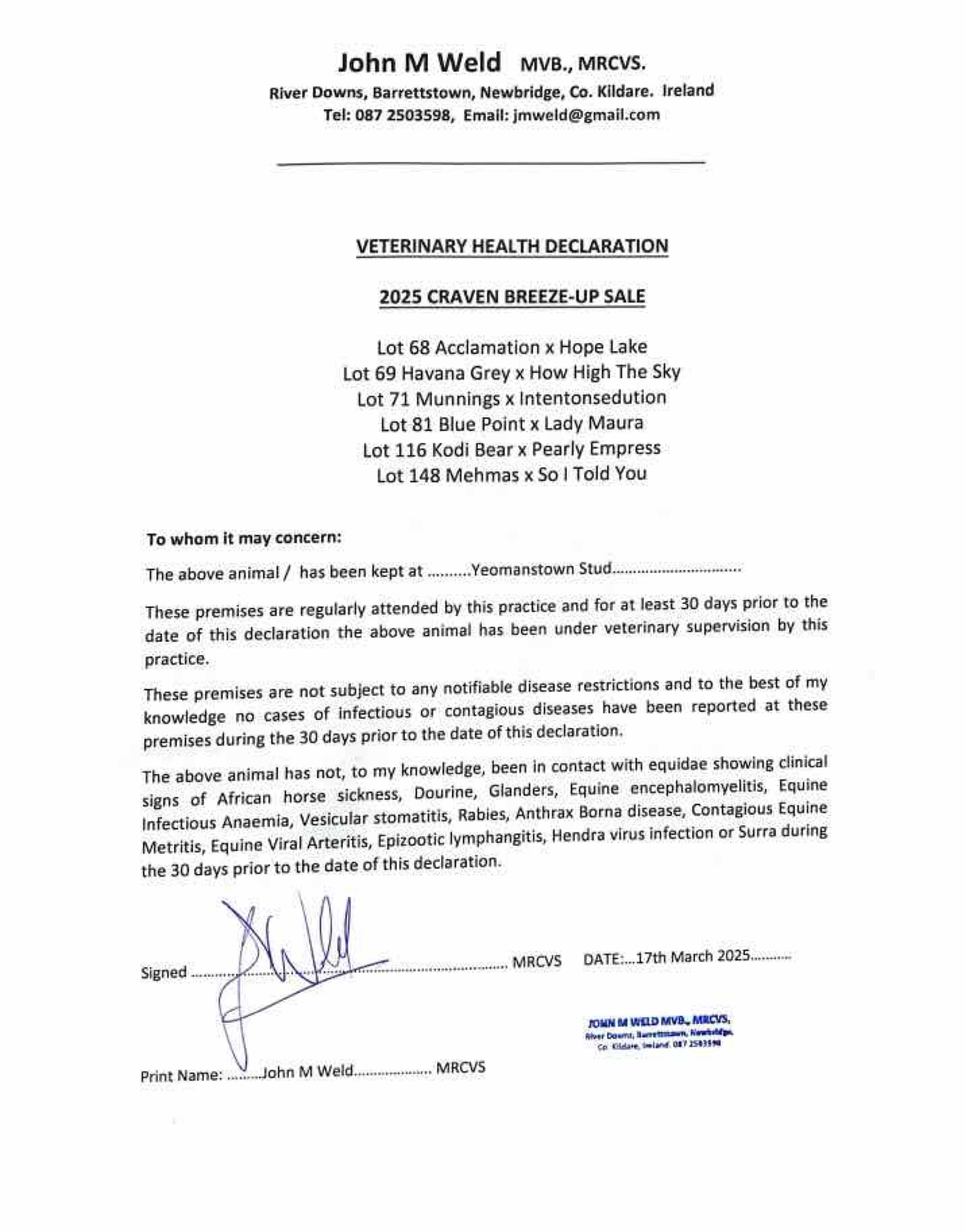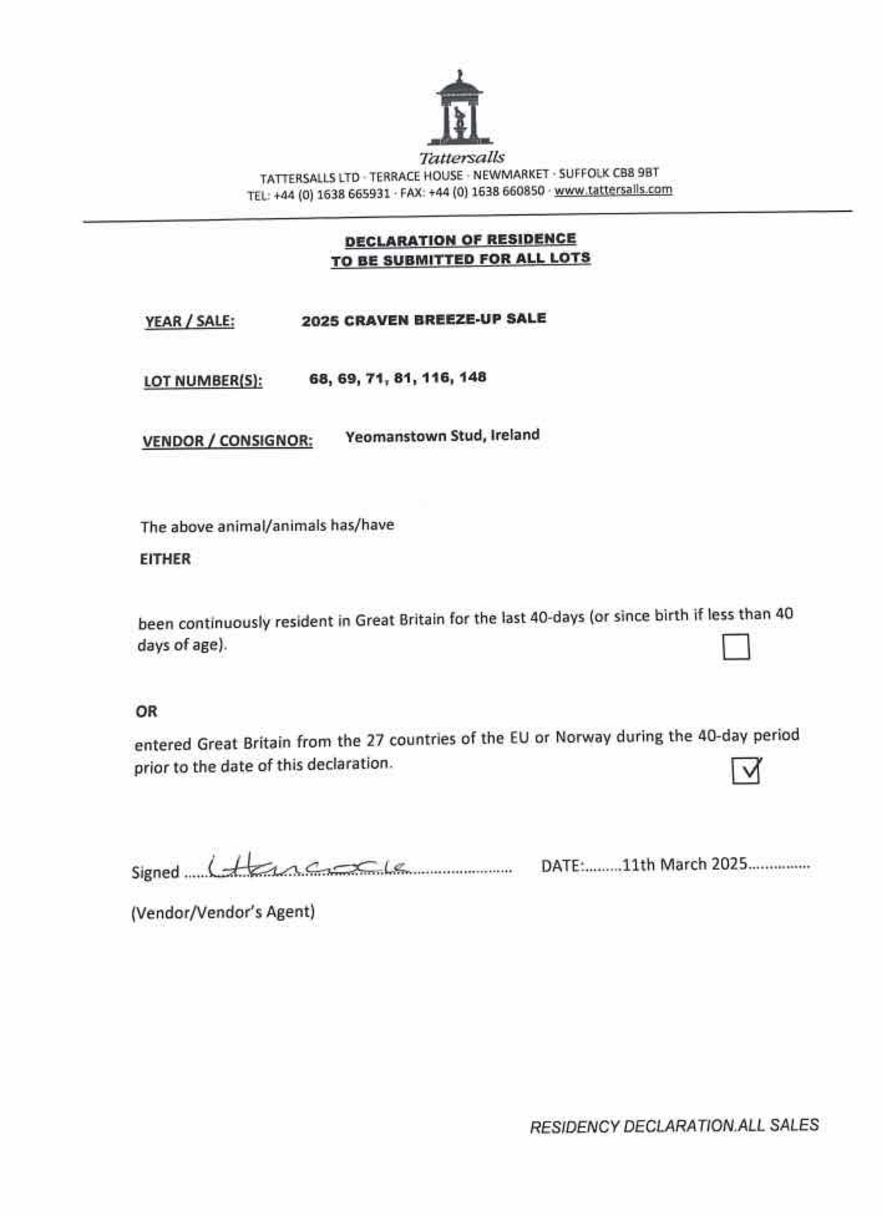 Consignor: Yeomanstown Stud, Ireland