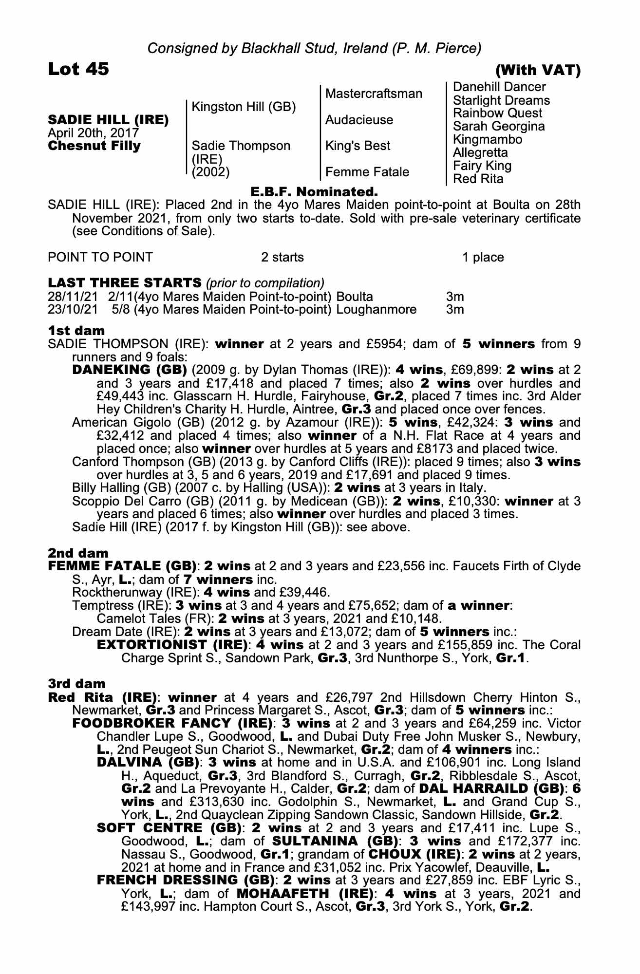 Consignor: Blackhall Stud, Ireland (P. M. Pierce)