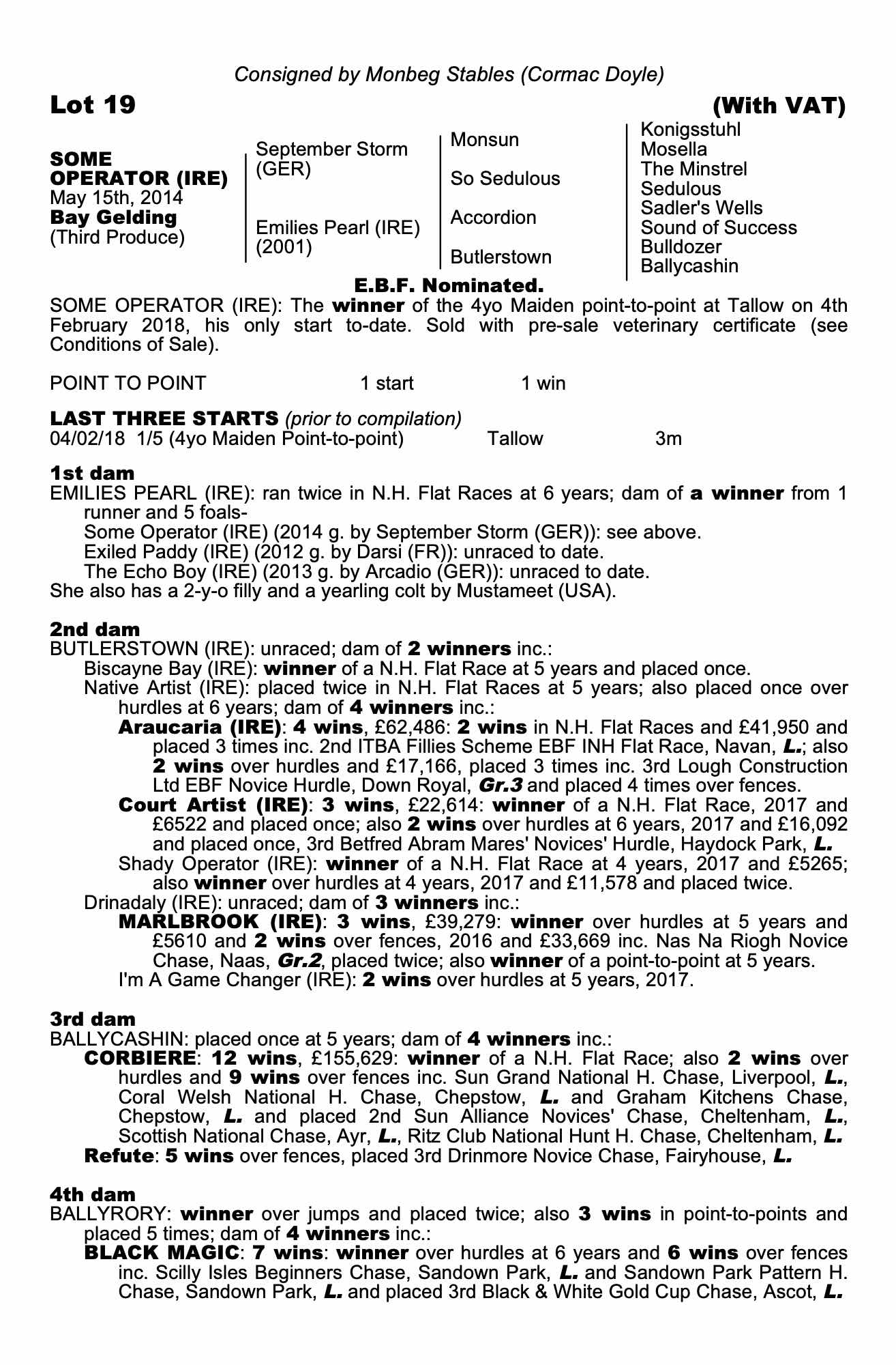Some Operator produced a very taking debut performance at Tallow in February in the four-year-old maiden on what was the opening weekend of this age category. Ridden prominently throughout, the son of September Storm travelled strongly on the final mile where he progressed to lead from the final fence and kept on gamely in the closing stages to hold onto the victory by a length over the runner-up who was a favourite from the Denis Murphy yard.From the family of the Grade three placed Araucaria and the Grade two placed Marlbrook, Some Operator is also related to the Listed and 12-time winner Corbiere. Some Operator highlighted himself as a game and tough individual who is bred to develop into a smart track sort which makes him an exciting addition to the sale.