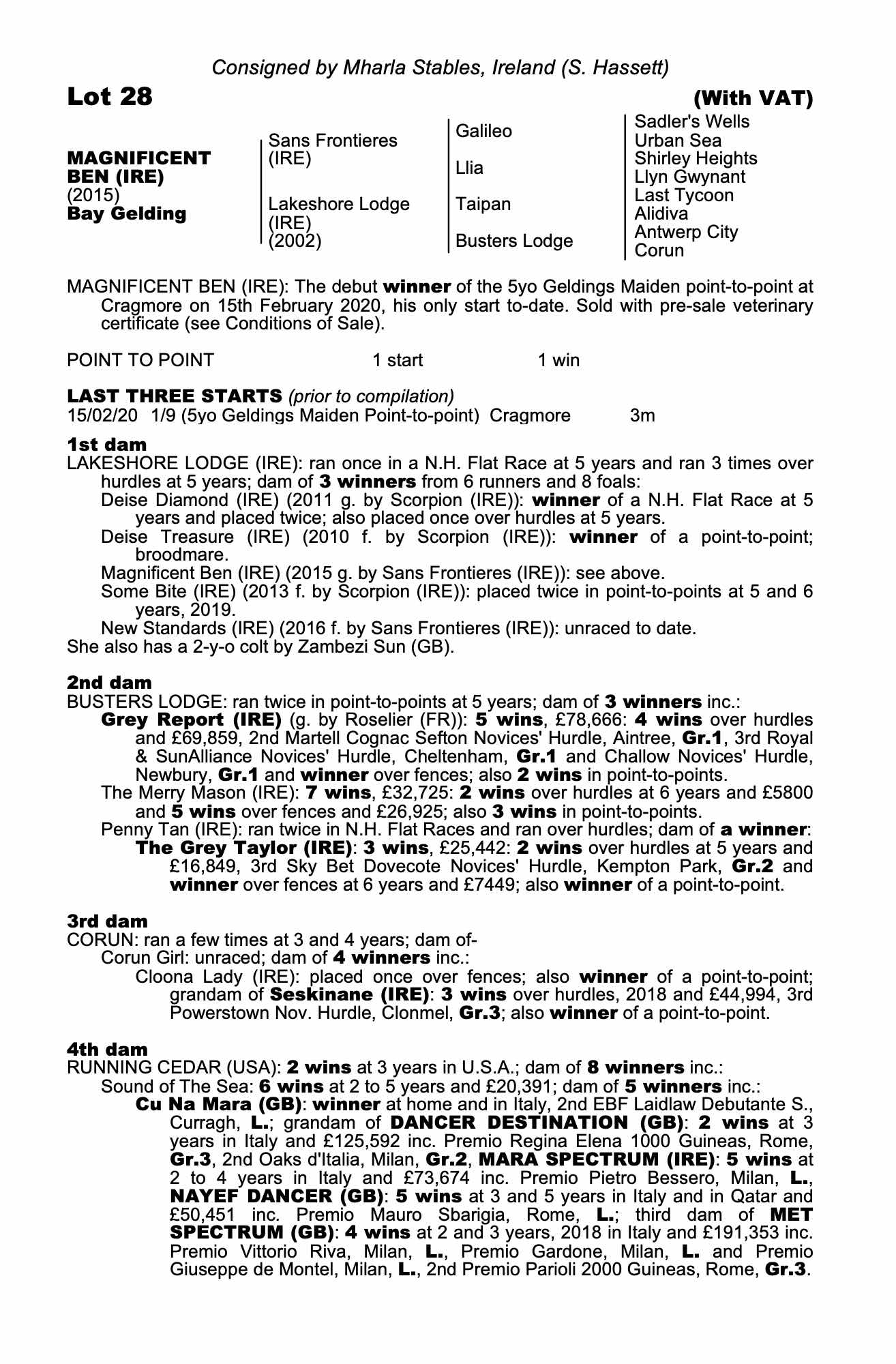 Magnificent Ben heads to the sales following his debut success in the five-year-old geldings’ maiden at Cragmore. The son of San Frontieres was patiently ridden in mid-division in the hands of John Barry for much of the contest, before making good headway when coming from off the pace at the halfway point, to then progress to lead after jumping the penultimate fence, where he quickened away to get the better off the more-experienced Bourban Street by two lengths, with a further ten lengths back to the third placed finisher. Hailing from a family with a strong pedigree that includes seven-time track winner The Merry Mason, Magnificent Ben is bred to develop into a smart track sort and should prove capable of sampling middle distance track success under rules, who could have a lot to offer to new connections it seems.