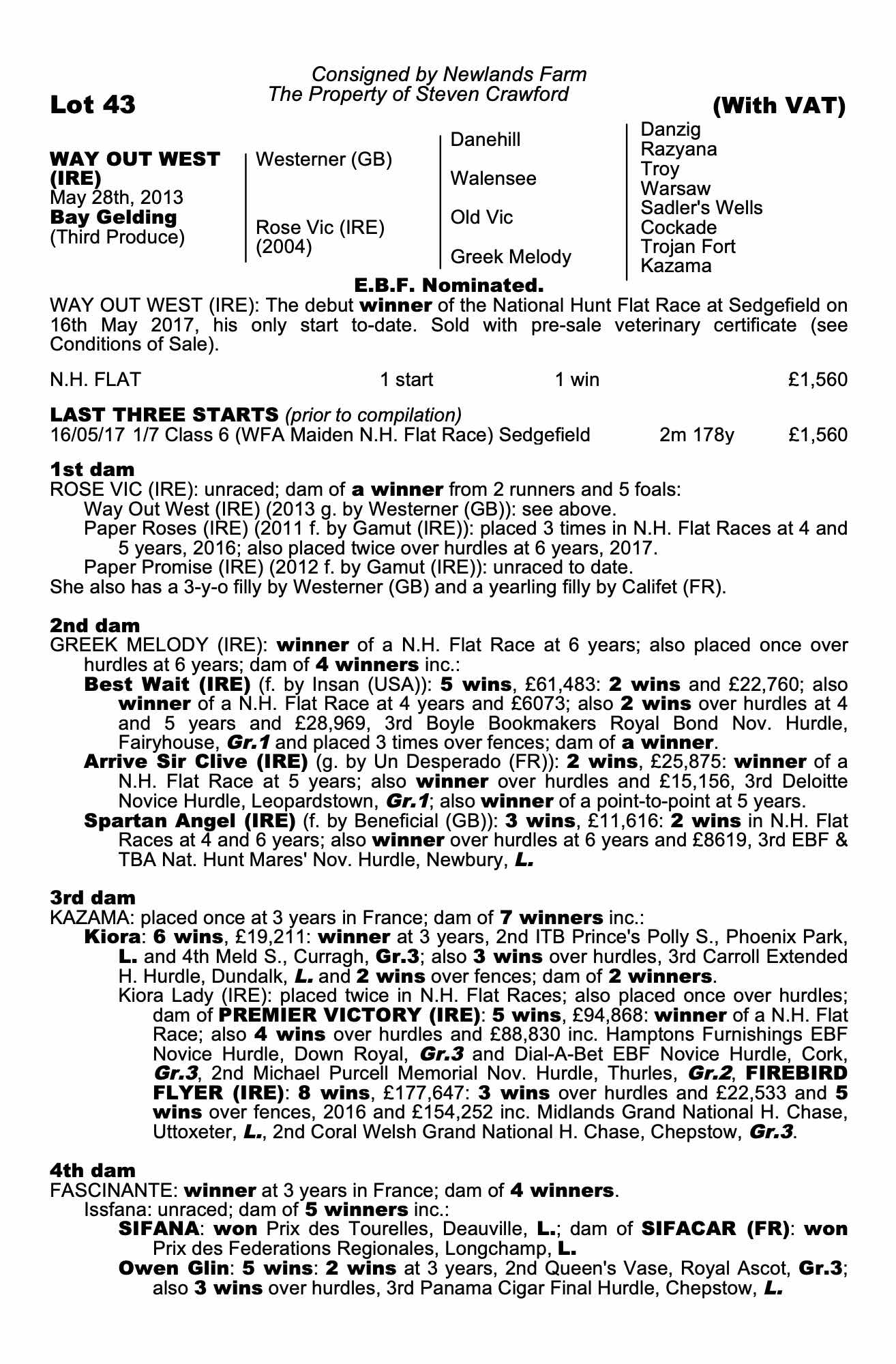 Way Out West travelled strongly throughout the race on his debut run to win his bumper at Sedgefield by 2 1/2 lengths and is sure to come on from this run and looks like a horse that will benefit from a galloping track and seems to have plenty of speed. A son of Westerner his dam is a half sister to the black type performers Best Wait, Arrive Sir Clive and Spartan Angel.