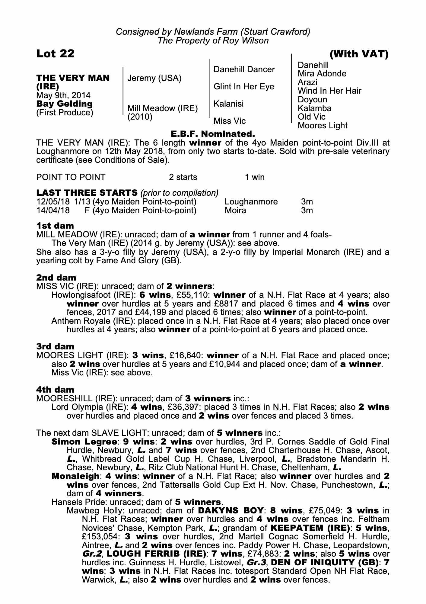 The Very Man made a massive impression when taking his four-year-old maiden at Loughanmore in May. The Stuart Crawford-trained gelding had made his debut at Moira in April where he came to grief at the sixth fence. Clearly none the worse for his fall, The Very Man was ridden in mid-division for much of the contest before making good headway between the final two fences and progressed to lead on the run to the final obstacle where he held a strong advantage over his rivals to go on and score by six lengths. By the ill-fated sire, Jeremy, The Very Man is from the family of some talented sorts which includes Den Of Iniquity, Keepatem and Lough Ferrib. This eye-catching gelding looks to have an ideal blend of speed and stamina which leads one to suggest that he should prosper at black-type level on the track.