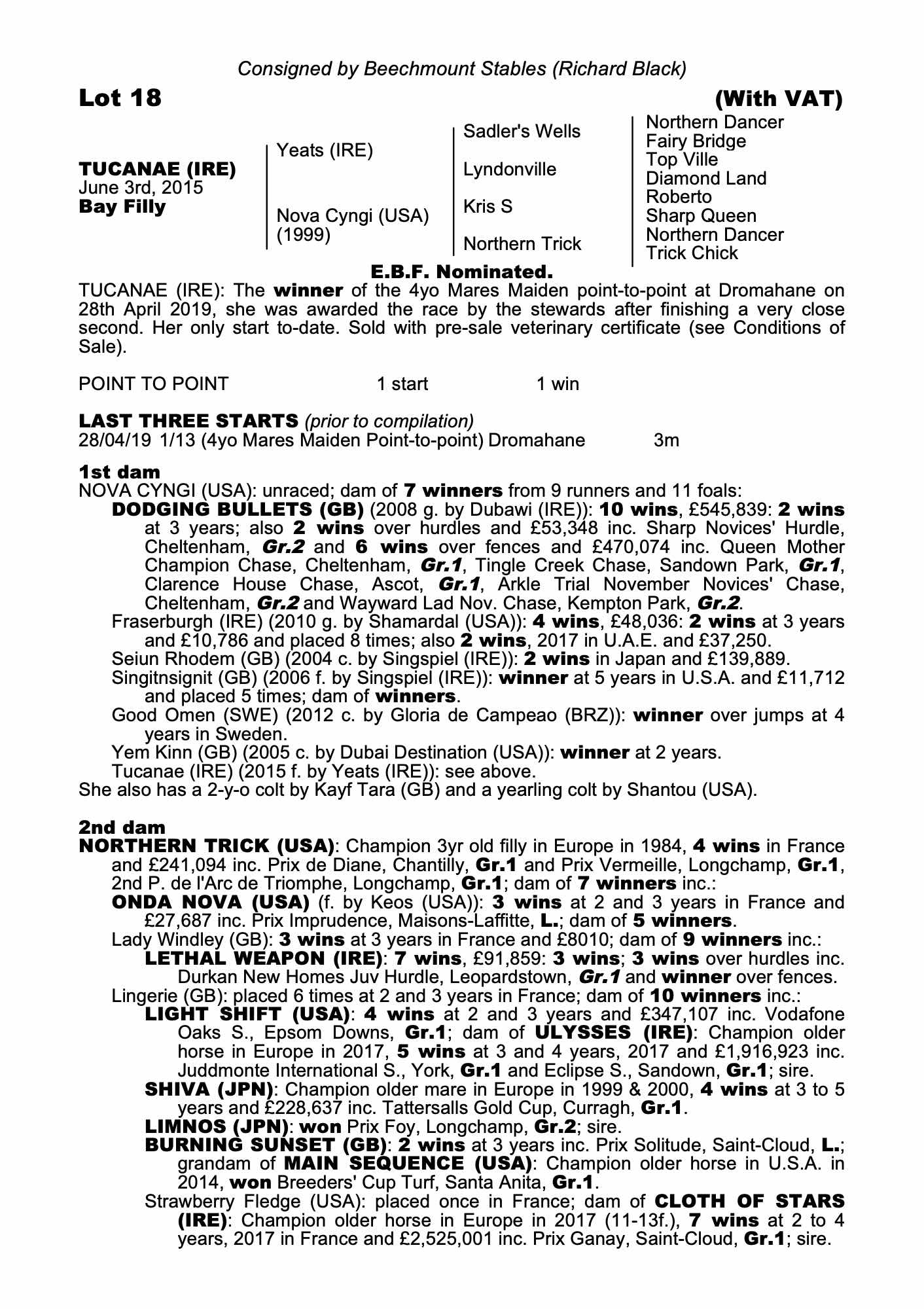Handled by Richard Black, Tucane put in an impressive debut performance to take the four-year-old mares’ maiden at Dromahane under the guidance of Luke Murphy at the end of April. The daughter of Yeats raced up with the pace and having being badly hampered on the run to the last when coming to throw down a strong challenge, crossed the line a neck behind Noreen Bawn who subsequently sold for €220,000, however the placings were subsequently reversed in a stewards enquiry following interference from the last. This particular Maiden has an illustrious roll of honour which includes last year's winner Honeysuckle. Tucanae is a half-sister to former Queen Mother Champion Chase winner Dodging Bullets and is a strong filly who looks set to develop into a smart track performer in the future.