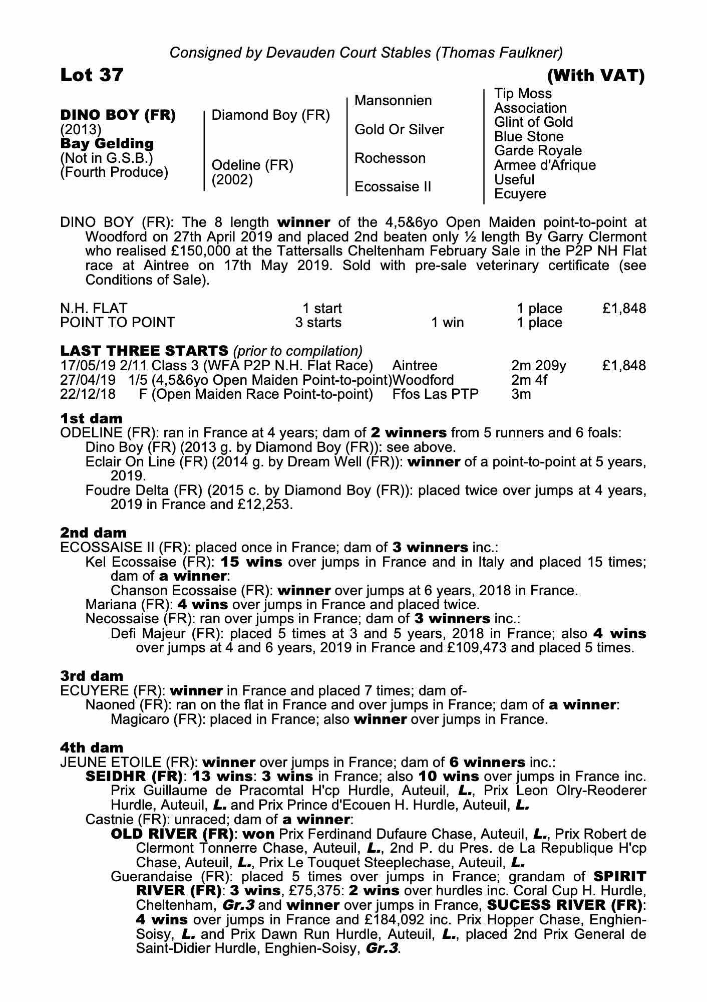 Dino Boy is a most progressive individual who broke his Maiden in fine style when drawing clear to win the 4,5 & 6yo Open Maiden point-to-point at Woodford for Thomas Faulkner on 27th April. He followed that by posting a big performance when placed 2nd beaten only 1/2 length in the P2P Bumper at Aintree on 17th May to the highly regarded Garry Clermont who was sold at the Tattersalls Cheltenham February Sale for £150,000 to Jonjo O'Neill. He raced alongside that rival throughout the contest and looked likely to have his measure halfway up the run-in before only narrowly losing out. A fine, strong, scopey individual he looks sure to make up into a very useful chaser under rules.
