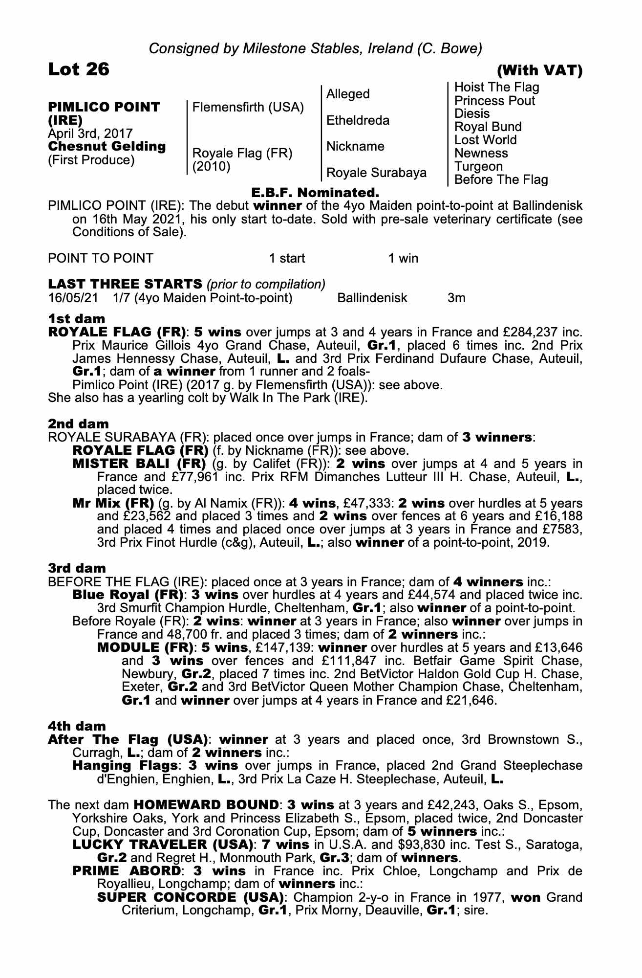A significant addition to any catalogue and has the profile to develop into a top NH performer. In a year where Irish pointers have enjoyed so much Grade 1 success at Cheltenham and beyond it is horses such as this which allow this success. A 95,000 store with a strong pedigree being out of a Grade 1 winning mare points to him fitting the profile of one who can go all the way to the top of the NH sphere. Being by Flemensfirth and out of Nickname he will relish the winter programme and his class which he clearly illustrated on his impressive Ballindenisk debut is already plain to see. He ticks every box to go on and become yet another exciting graduate from the pointing fields and will be an exciting addition to any trainer or owners string.