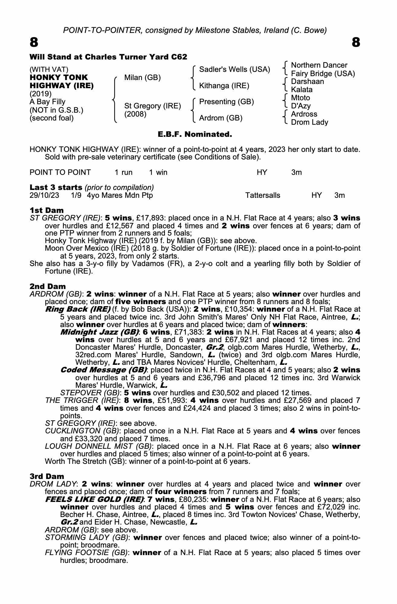 A hugely impressive winner of her debut and indeed only run at Tattersalls. In testing conditions that provided a true test she, along with runner up Diva Luna, quickened away impressively from the second last but when the real pressure was applied this mare found generously and went away to win by three lengths. By Milan out of a Presenting mare she has a wonderful attitude and only moved into the race when asked having adopted a relaxed laid back approach to the early part of the race. She clearly has the perfect attitude for racing and to allow her maximise her considerable ability. If all of that was not enough to convince possible purchasers the time of the race was seventeen seconds faster than the average time on the way confirming she has ticked every box towards becoming a possible top class NH mare for the future.