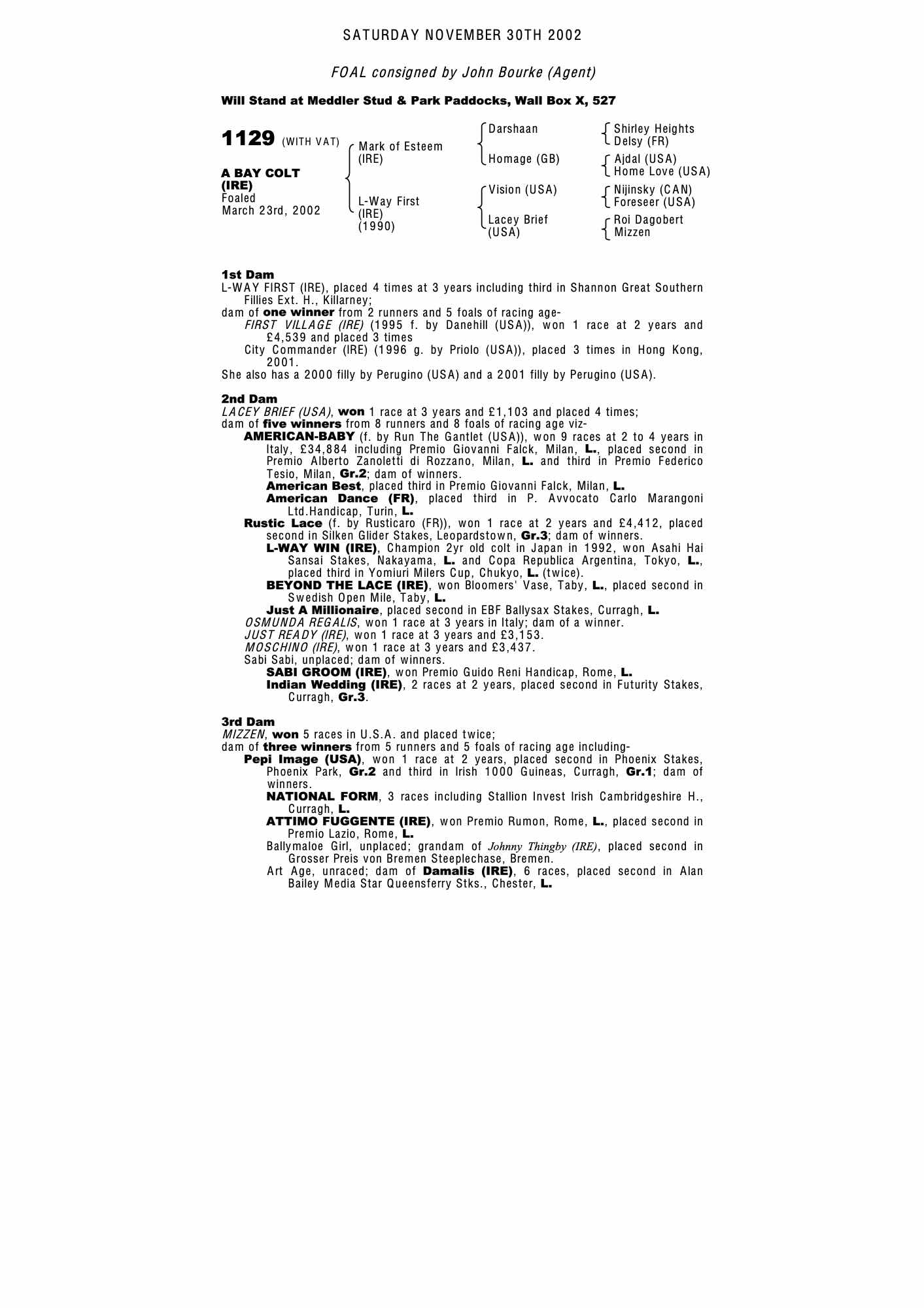 Breeders Flat Sale 2002 lot 123 F. by Perugino (USA) 2001, Ringfort Stud=>Eugene Wallace €1,000