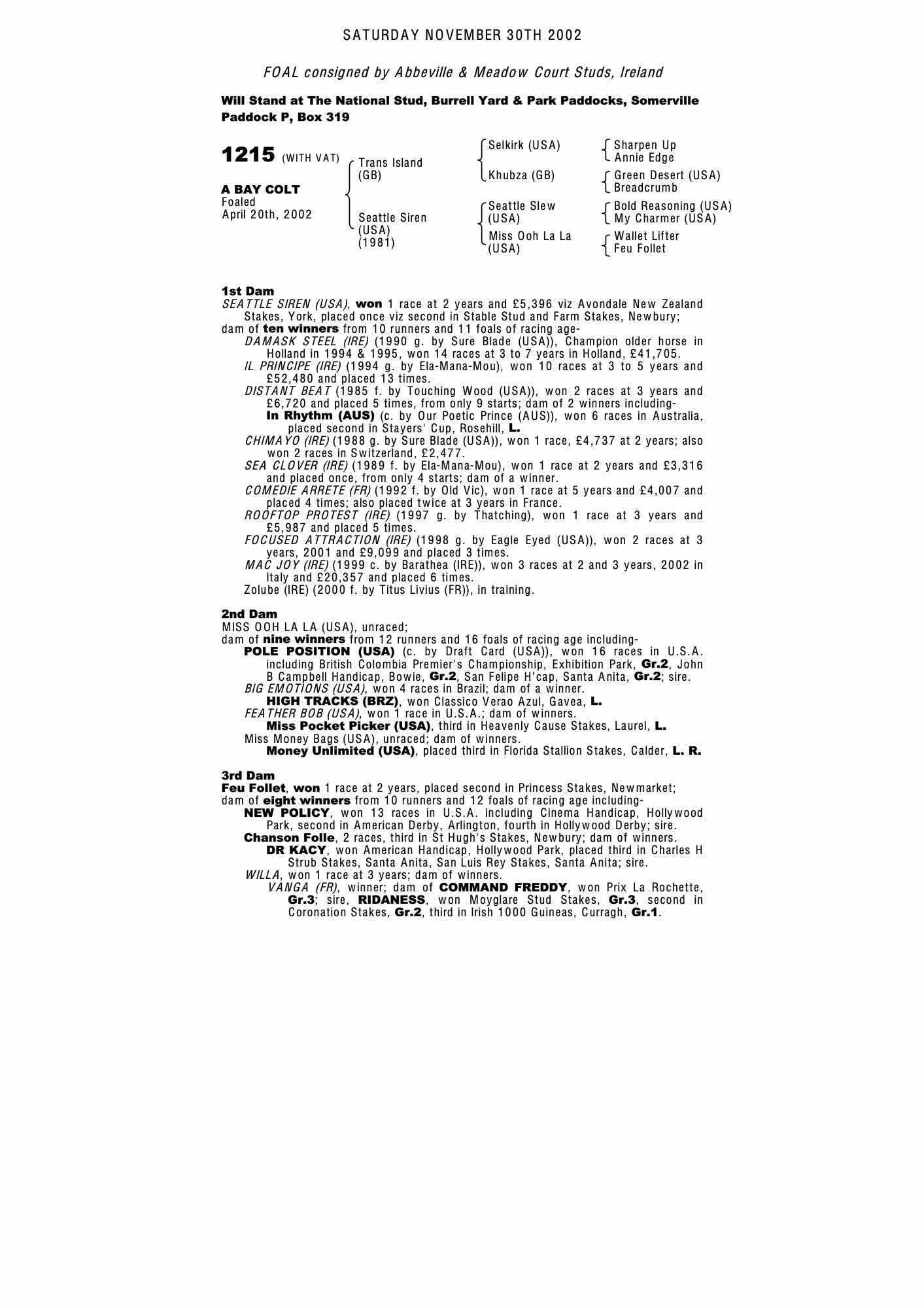 September Yearling Sale 2001 lot 530 F. by Titus Livius (FR) 2000, J.Costello=>John Berry €9,523