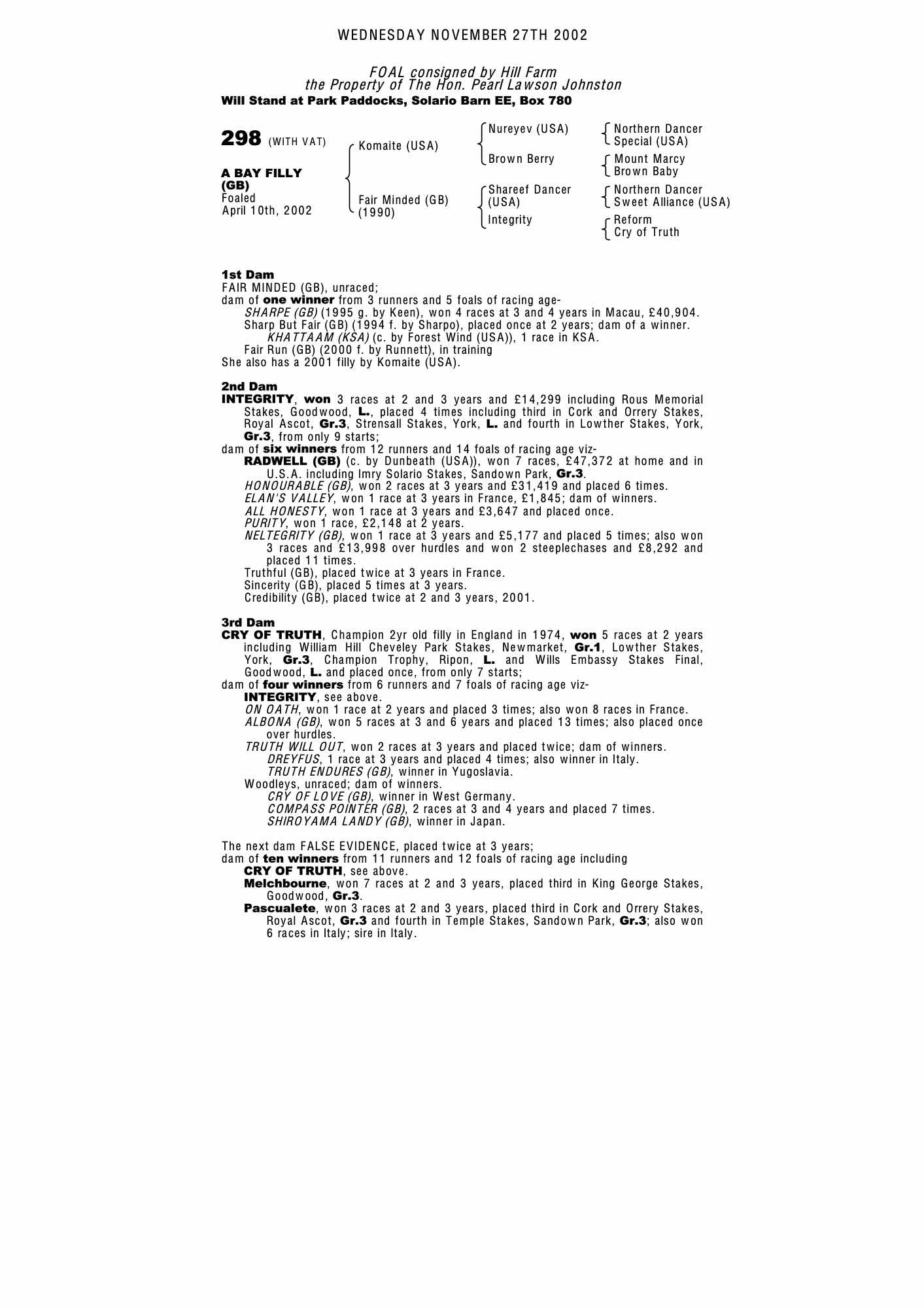 Autumn Horses in Training Sale 2002 lot 1120 Fair Run (GB) (F. by Runnett), Mask Cottage Stables=>Alexandros Kastrinos 1,600 gns